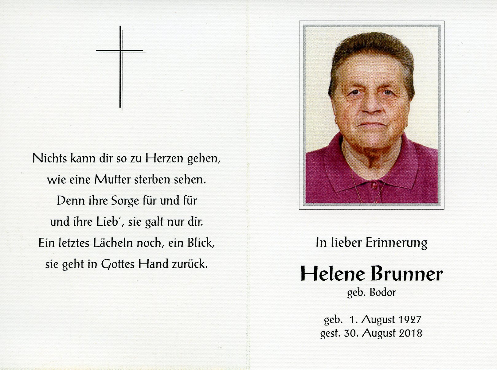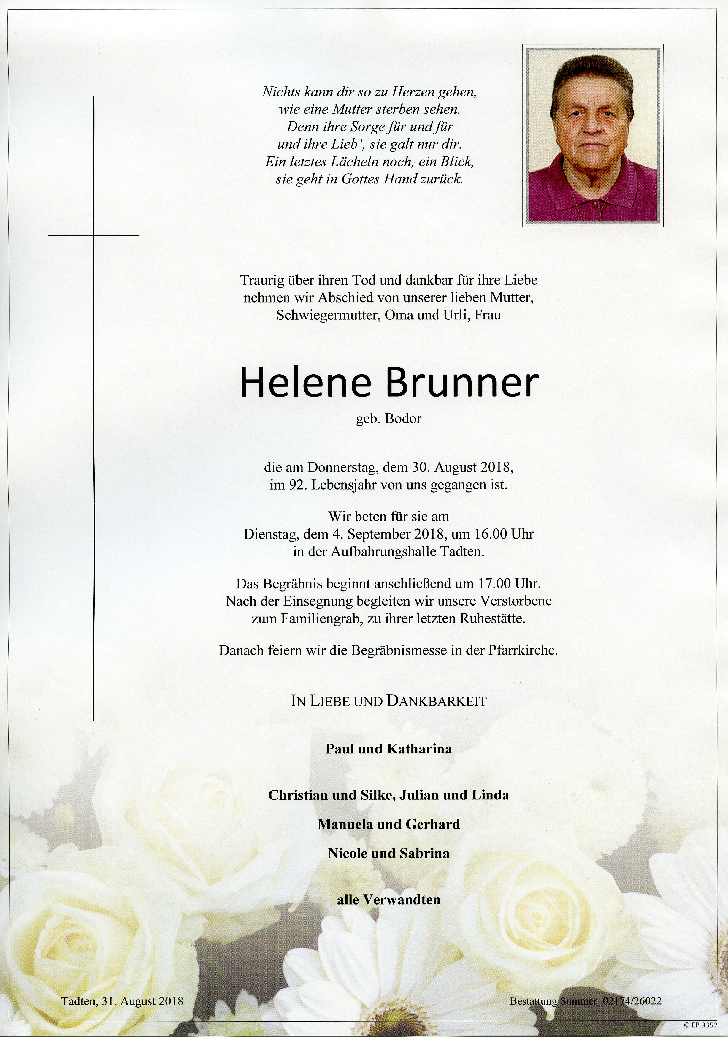 Brunner Helene aus 7162 Tadten, gestorben am 1. August 2018