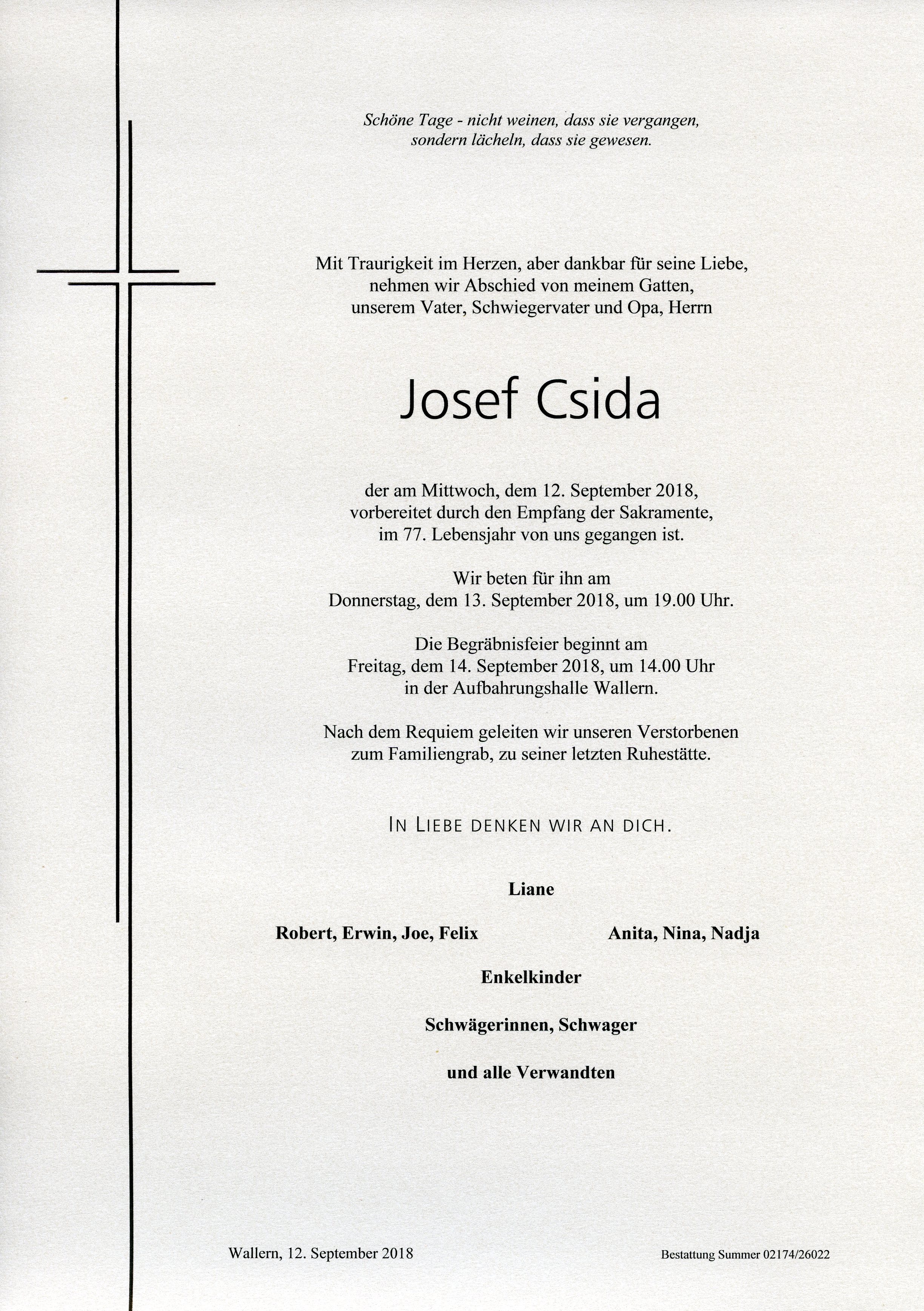 Csida Josef aus 7151 Wallern, gestorben am 12. September 2018