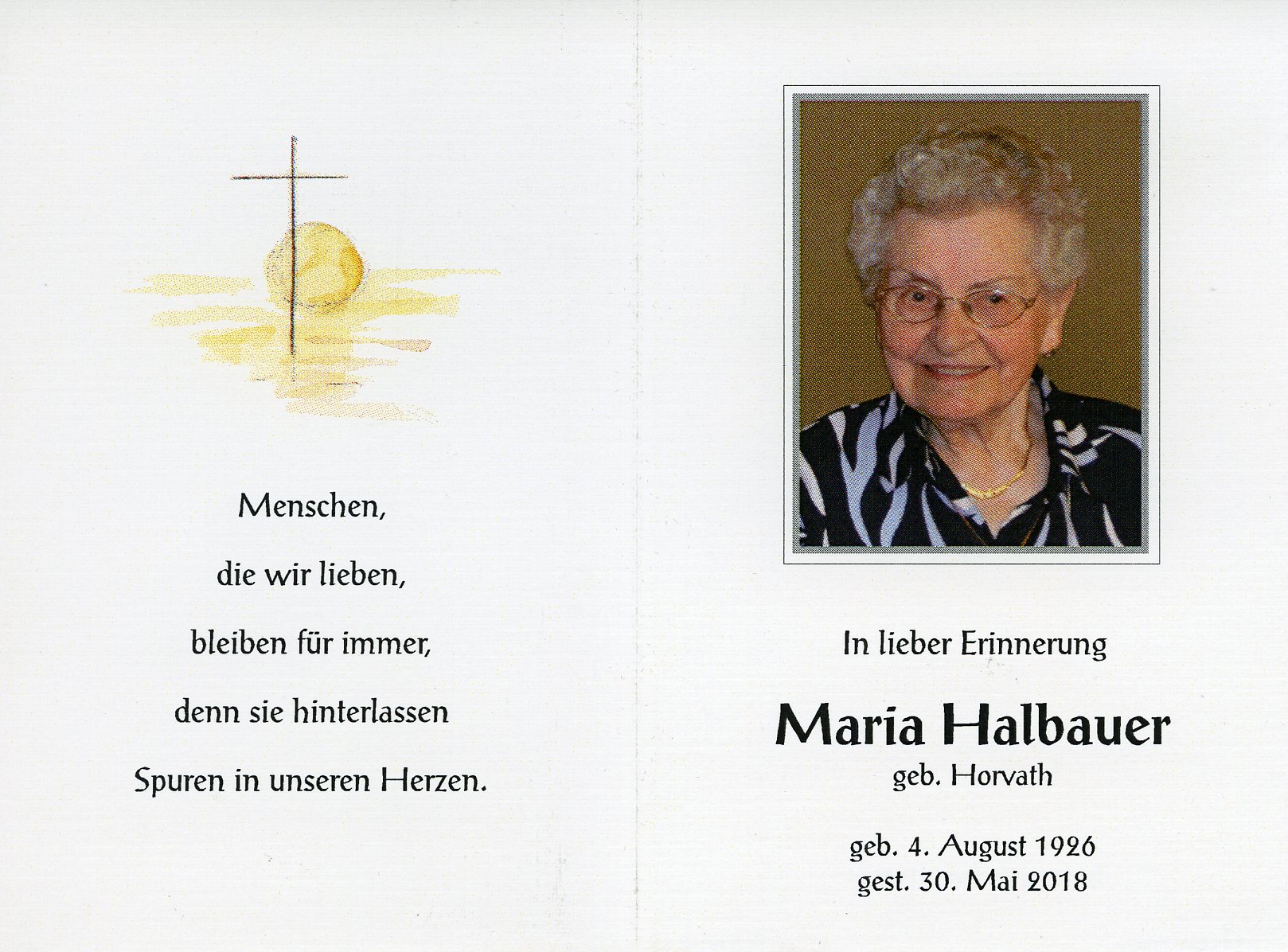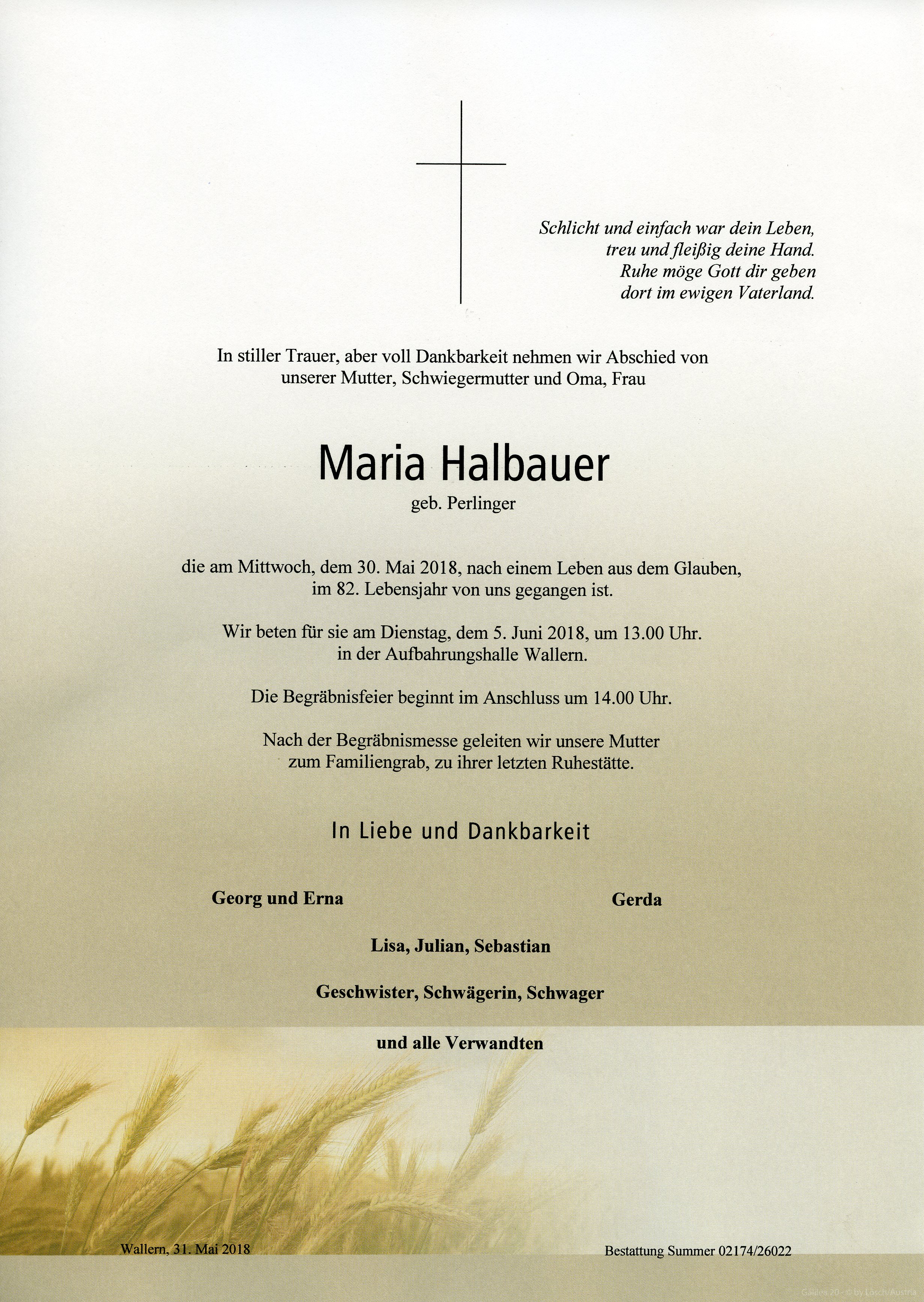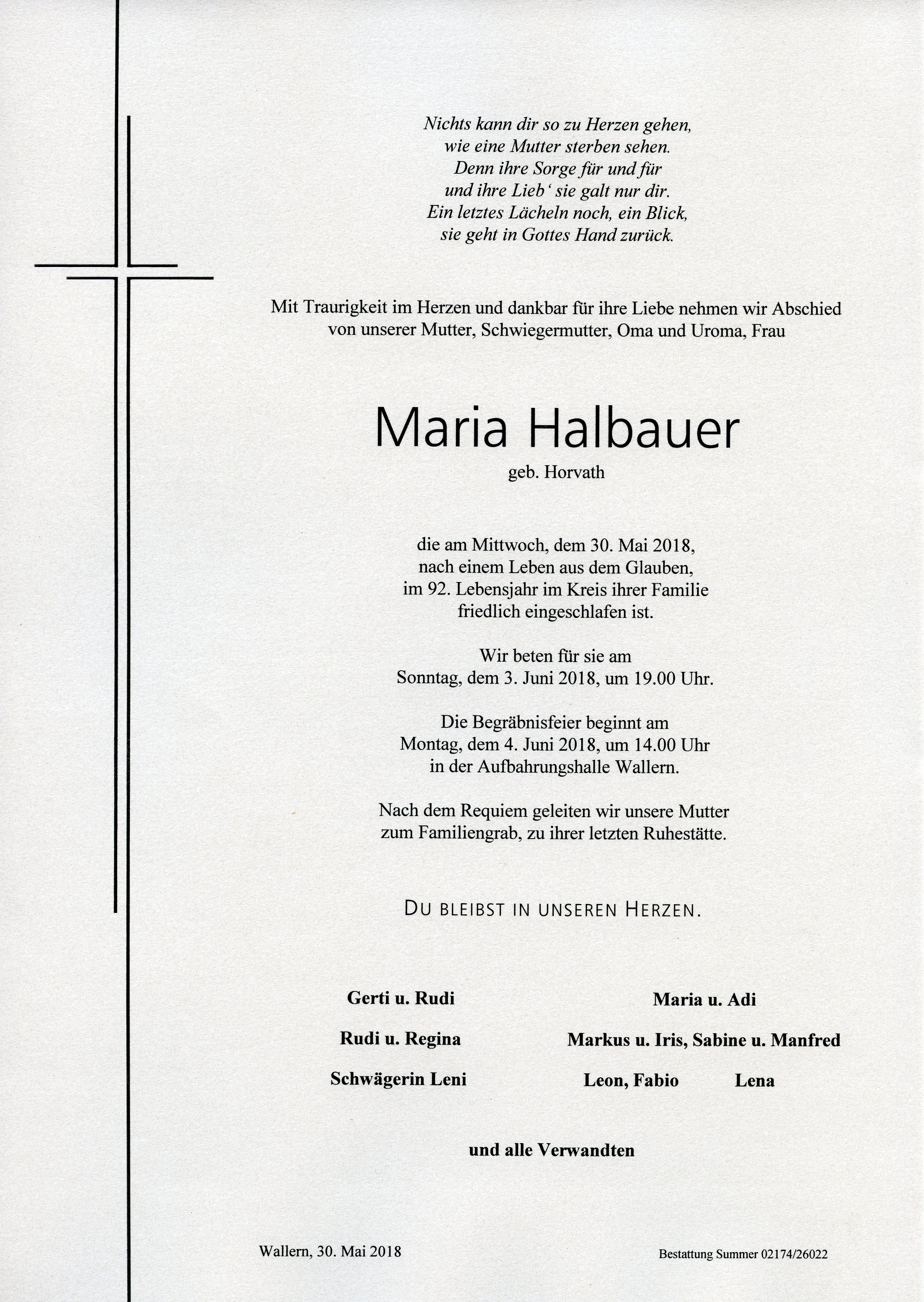 Halbauer Maria aus 7151 Wallern, gestorben am 30. Mai 2018
