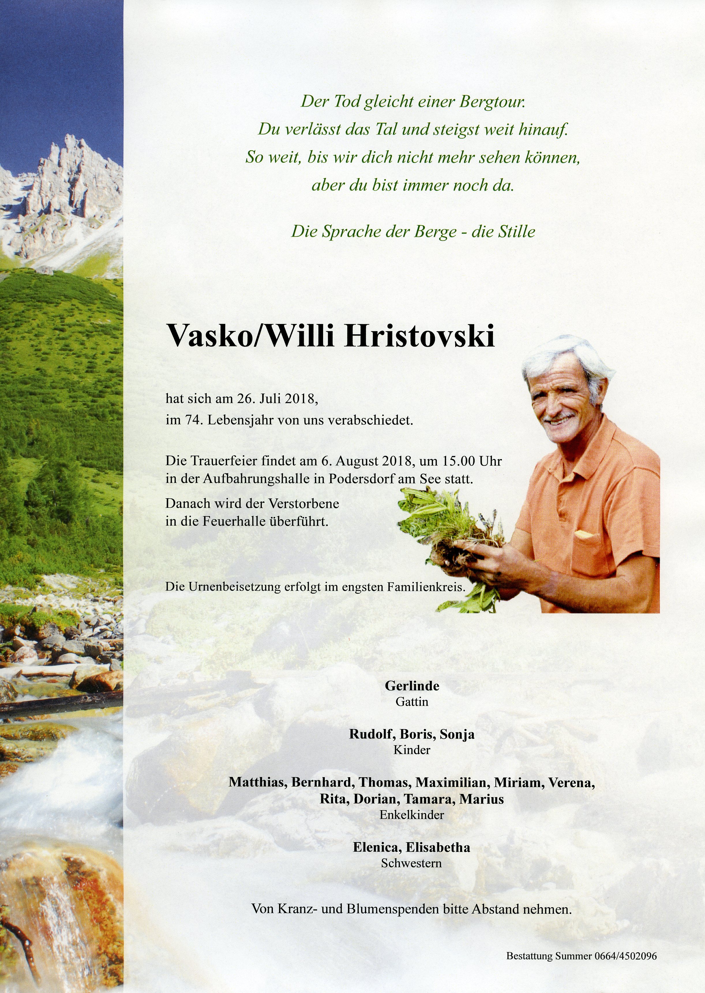 Hristovski Vasko/Willi aus 7141 Podersdorf, gestorben am 26.Juli 2018