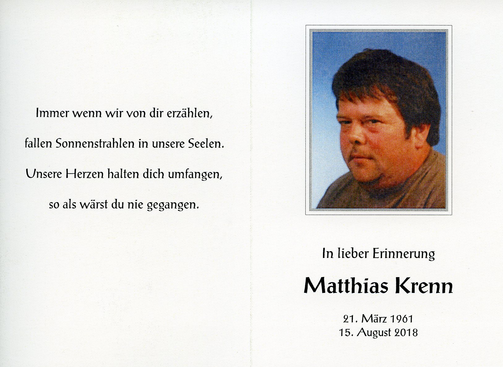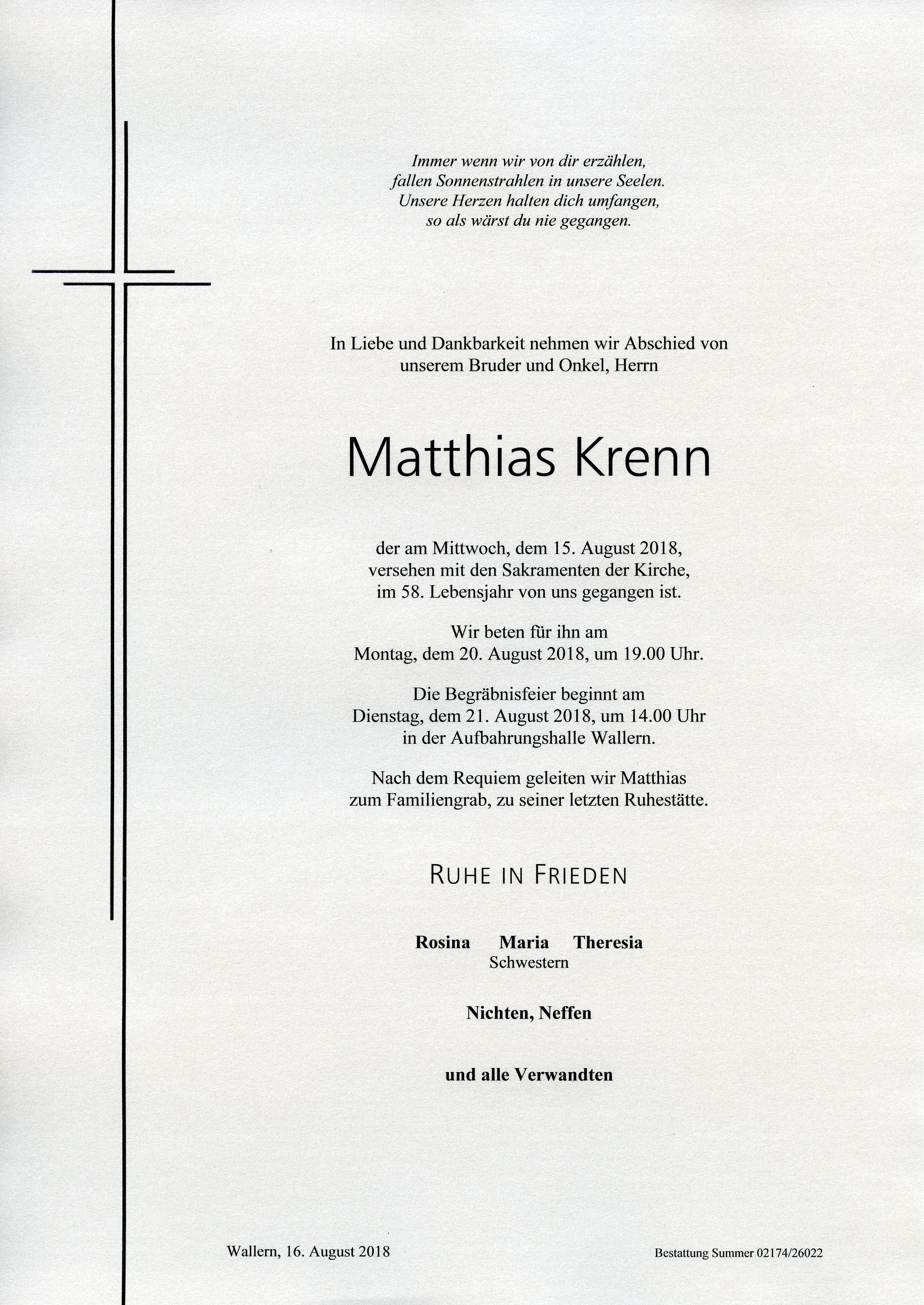 Krenn Matthias aus 7151 Wallern, gestorben am 15. August 2018