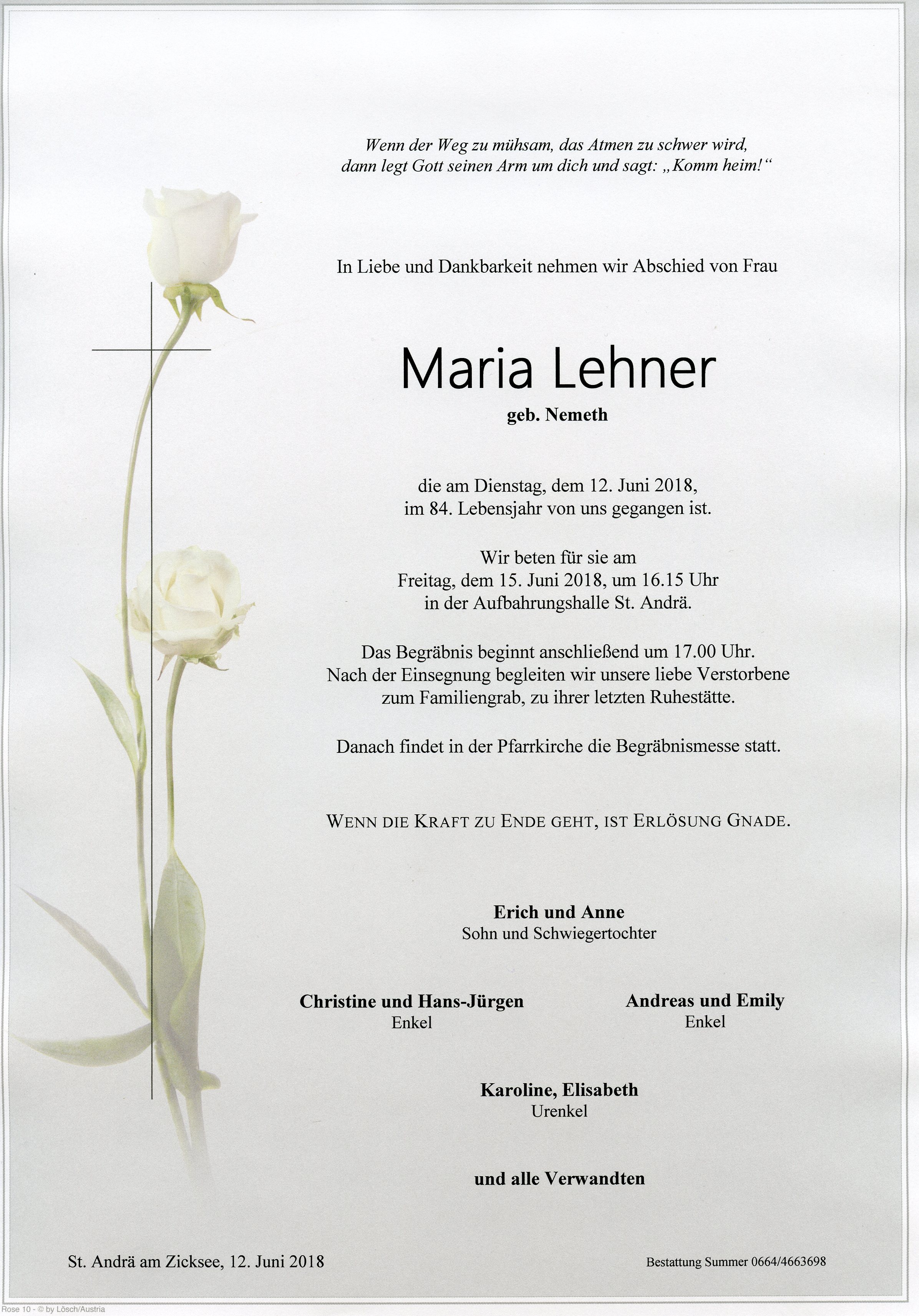 Lehner Maria aus 7161 St. Andrä am Zicksee, gestorben am 12. Juni 2018