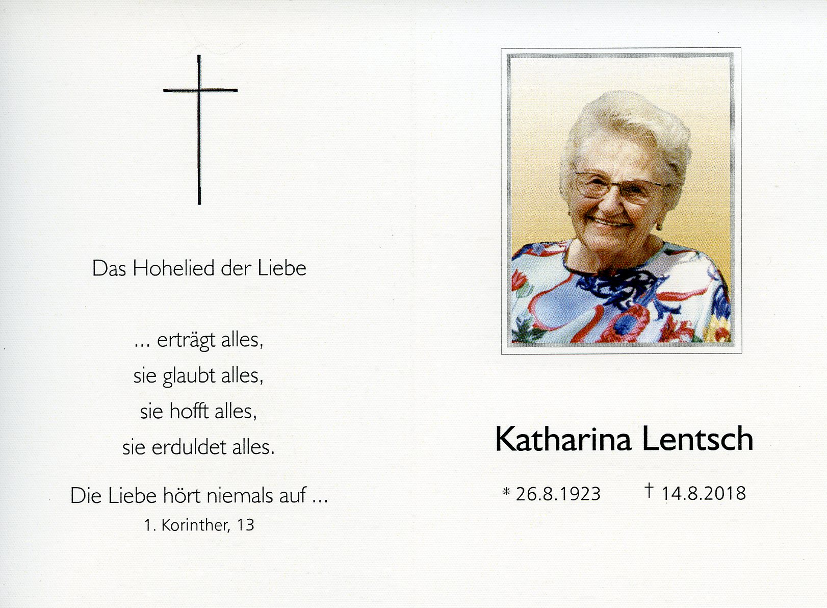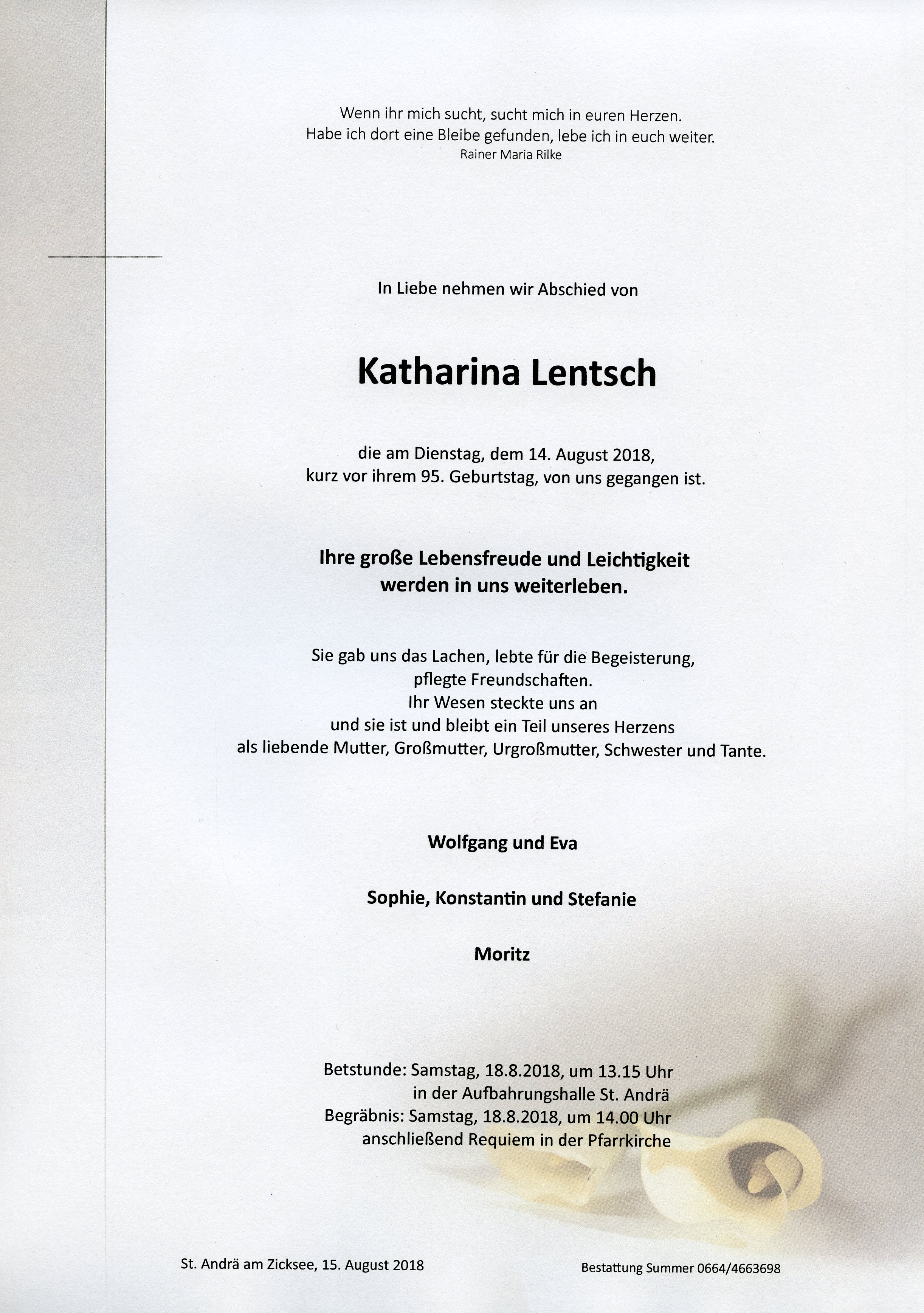 Lentsch Katharina aus 7161 St. Andrä am Zicksee, gestorben am 14. August 2018