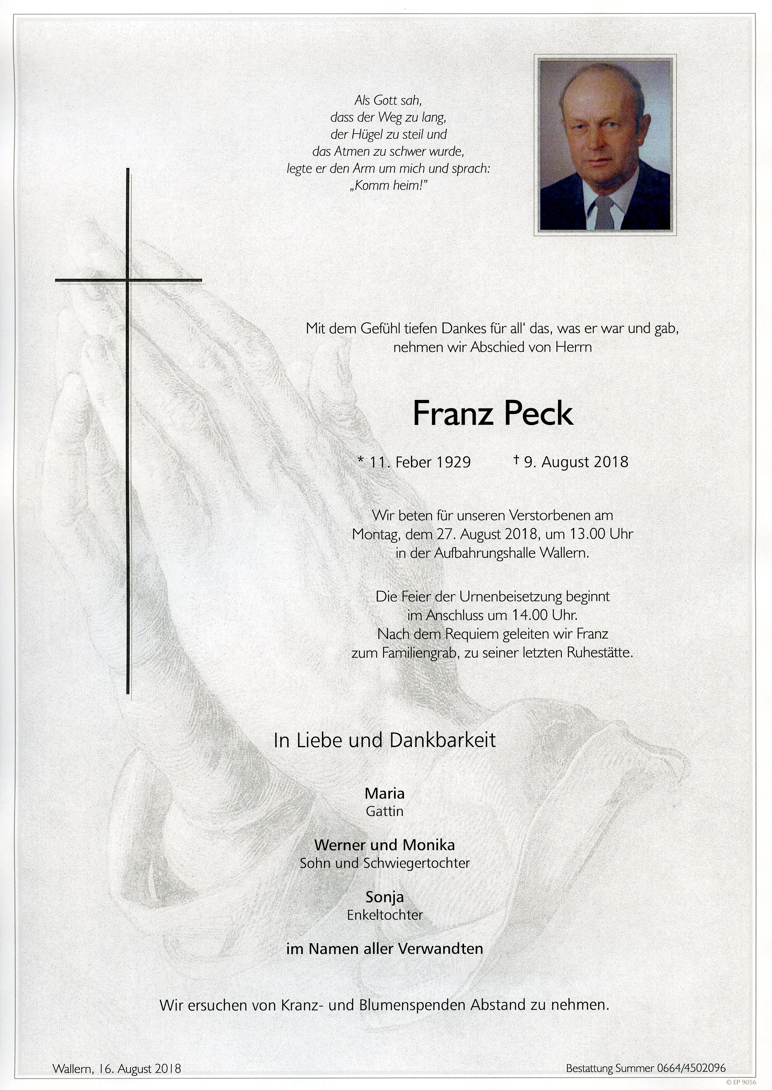 Peck Franz aus 7151 Wallern, gestorben am 9. August 2018