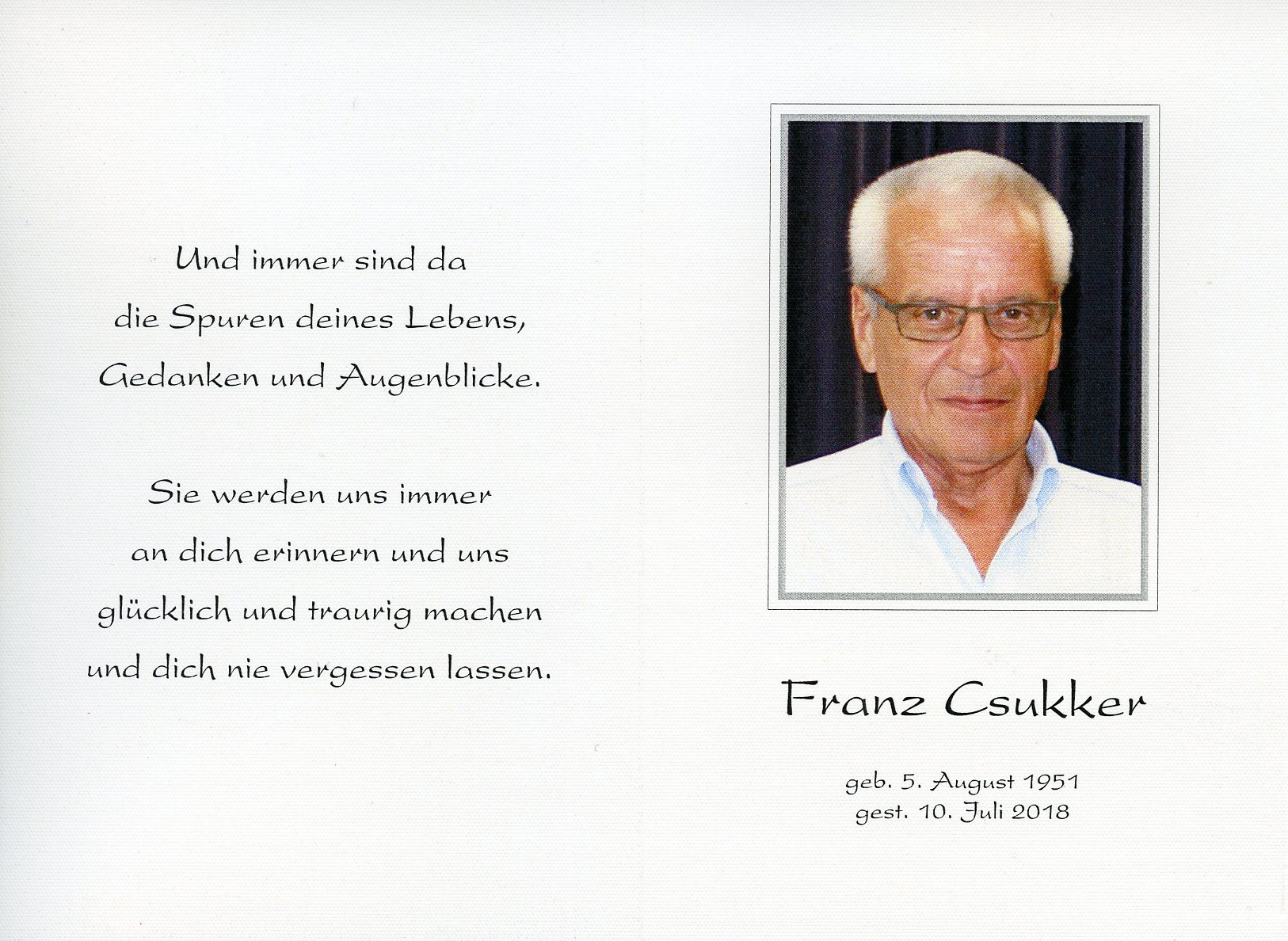 Csukker Franz aus 7151 Wallern, gestorben am 10. Juli 2018
