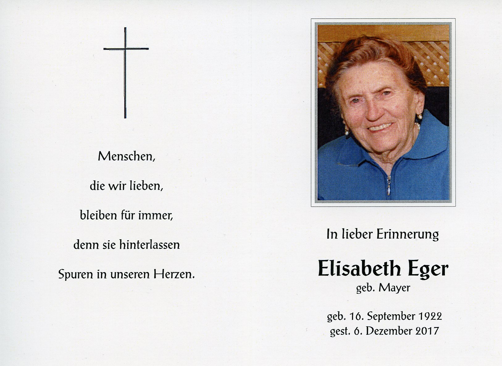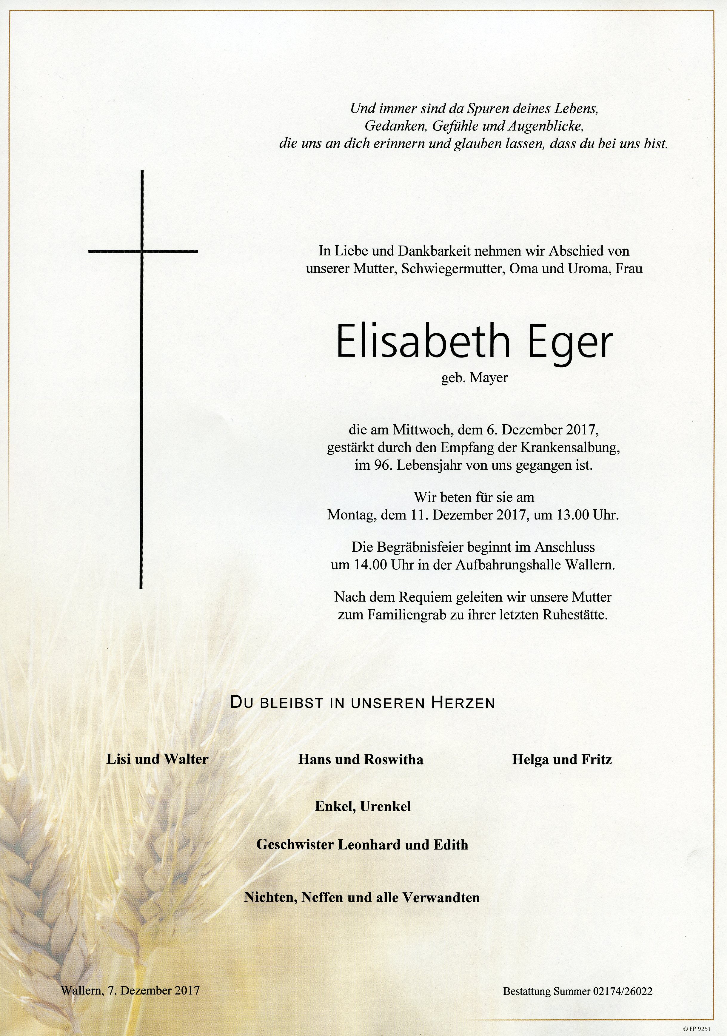 Eger Elisabeth aus 7151 Wallern, gestorben am 6. Dezember 2017