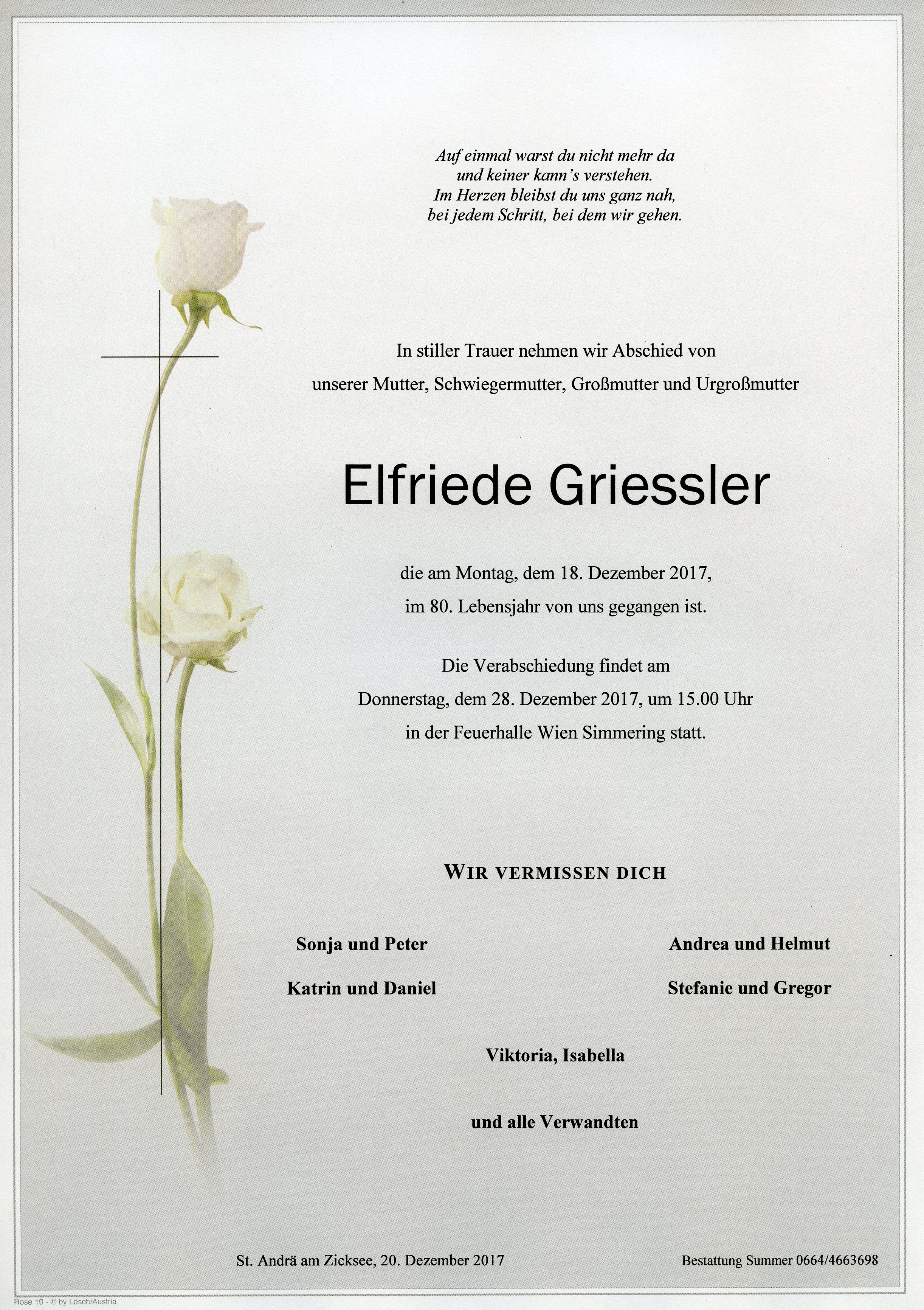 Griessler Elfriede aus 7161 St. Andrä am Zicksee, gestorben am 18. Dezember 2017