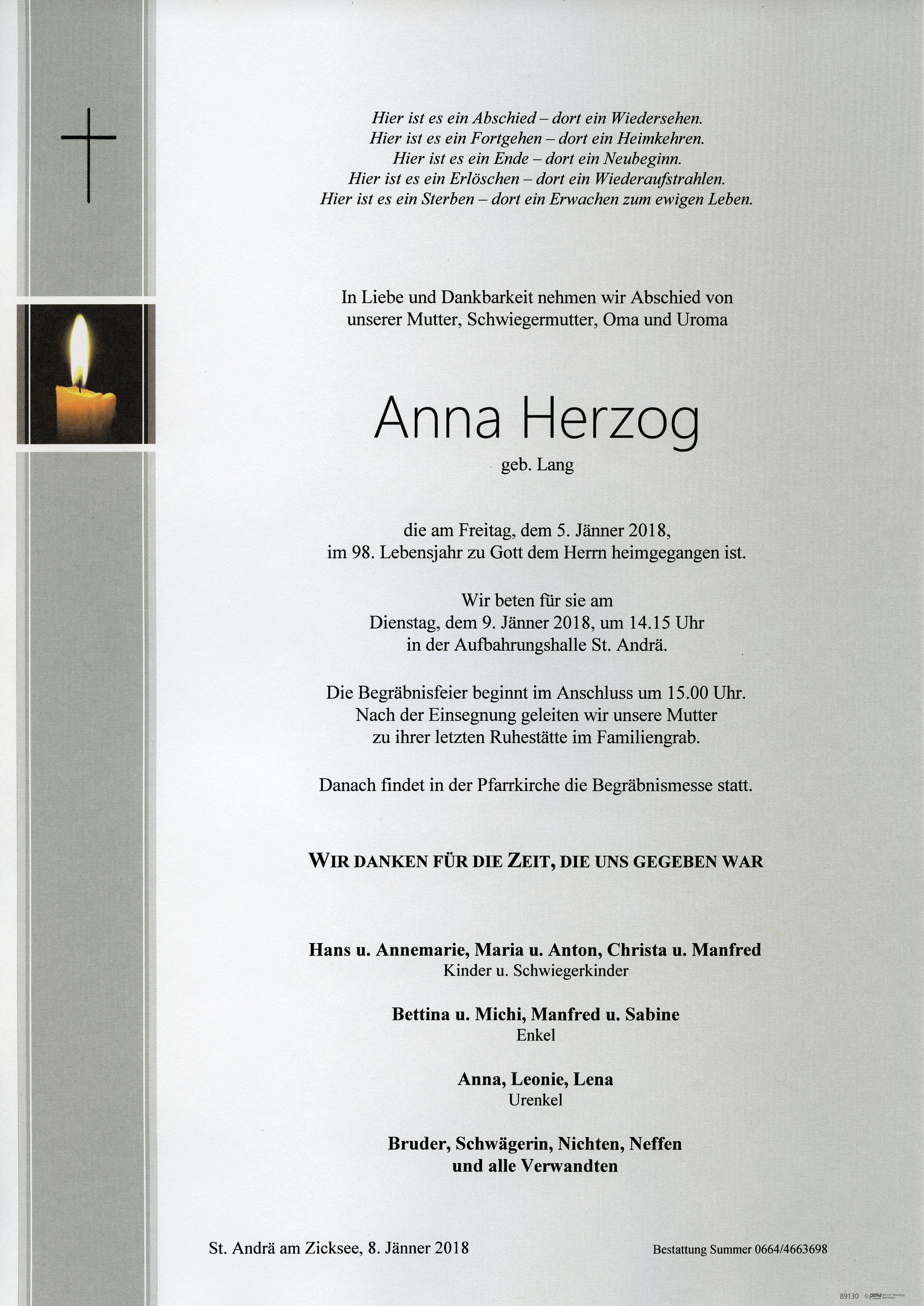Herzog Anna aus 7161 St. Andrä am Zicksee, gestorben am 5. Jänner 2018