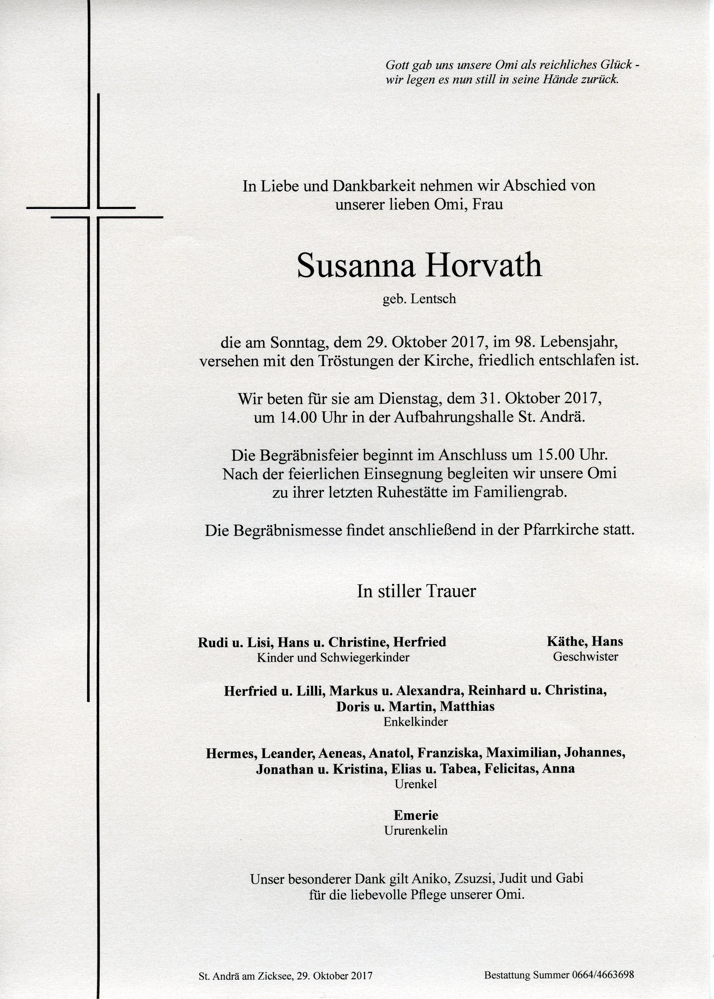 Horvath Susanna aus 7161 St. Andrä am Zicksee, gestorben am 29. Oktober 2017