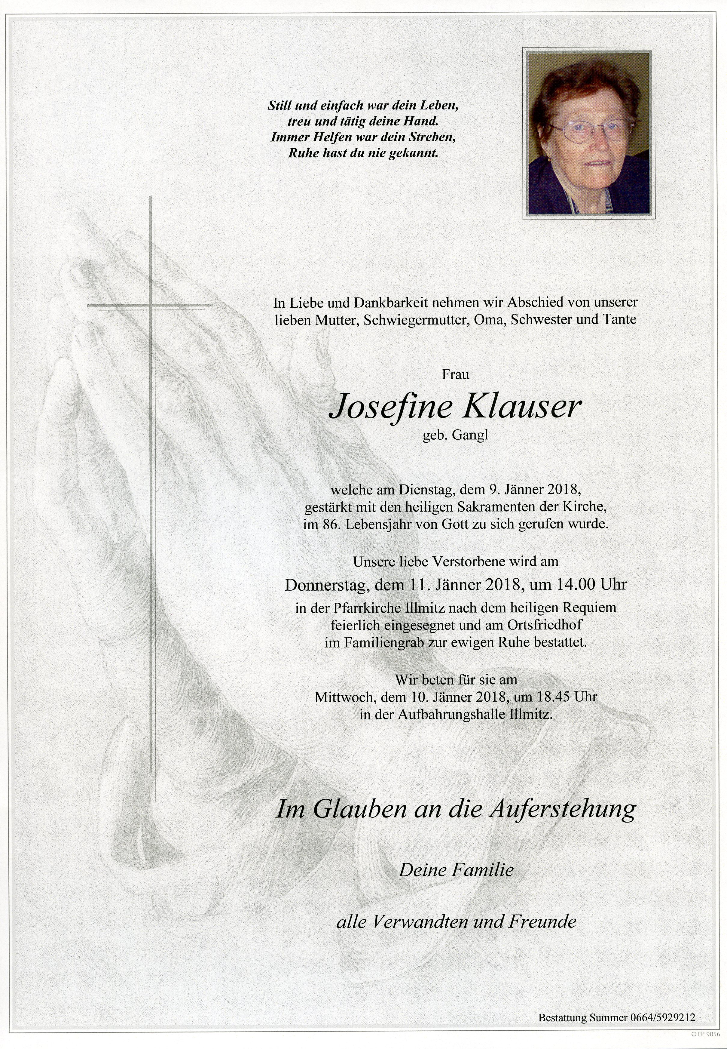 Klauser Josefine aus 7142 Illmitz, gestorben am 9. Jänner 2018