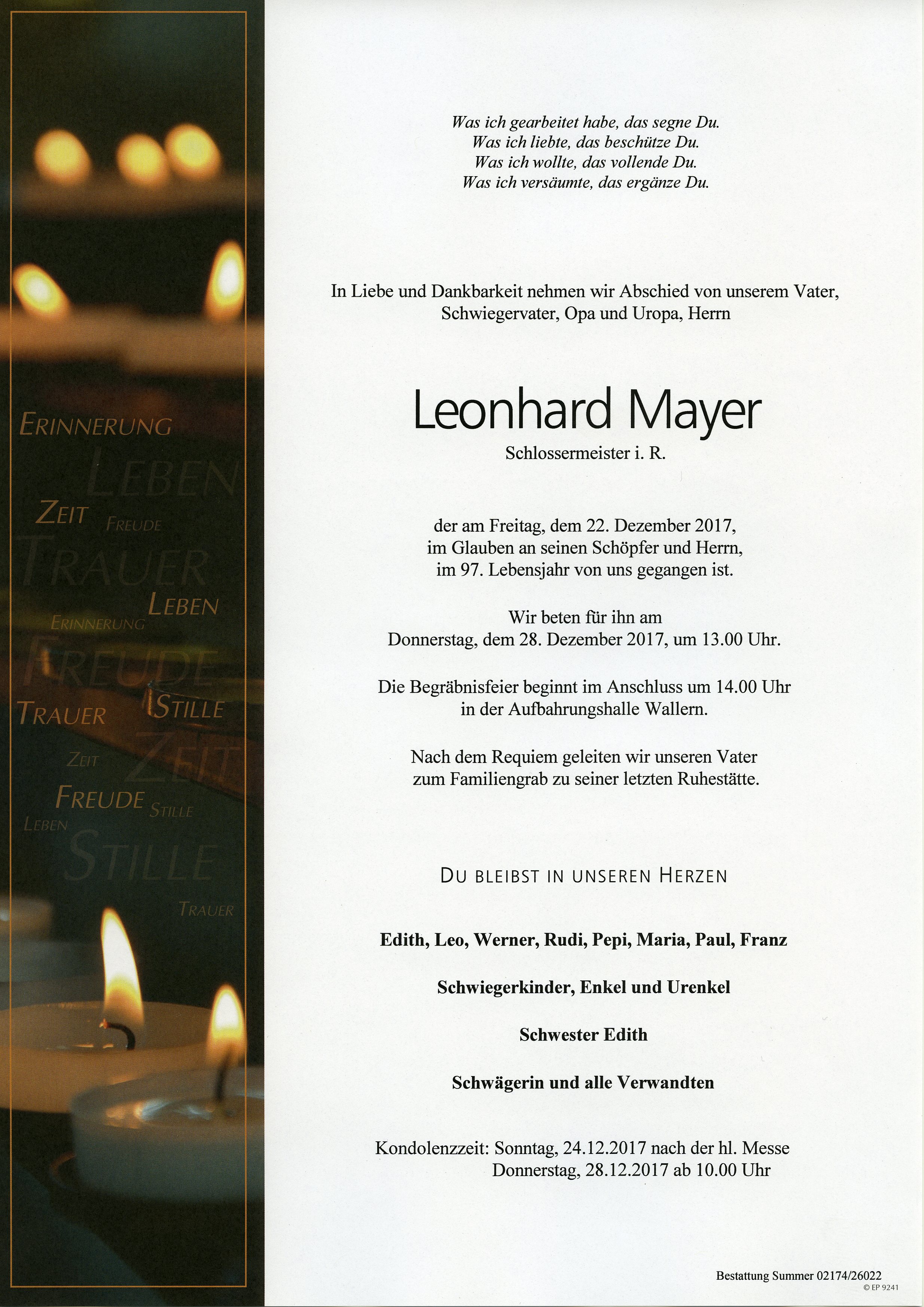 Mayer Leonhard aus 7151 Wallern, gestorben am 22. Dezember 2017