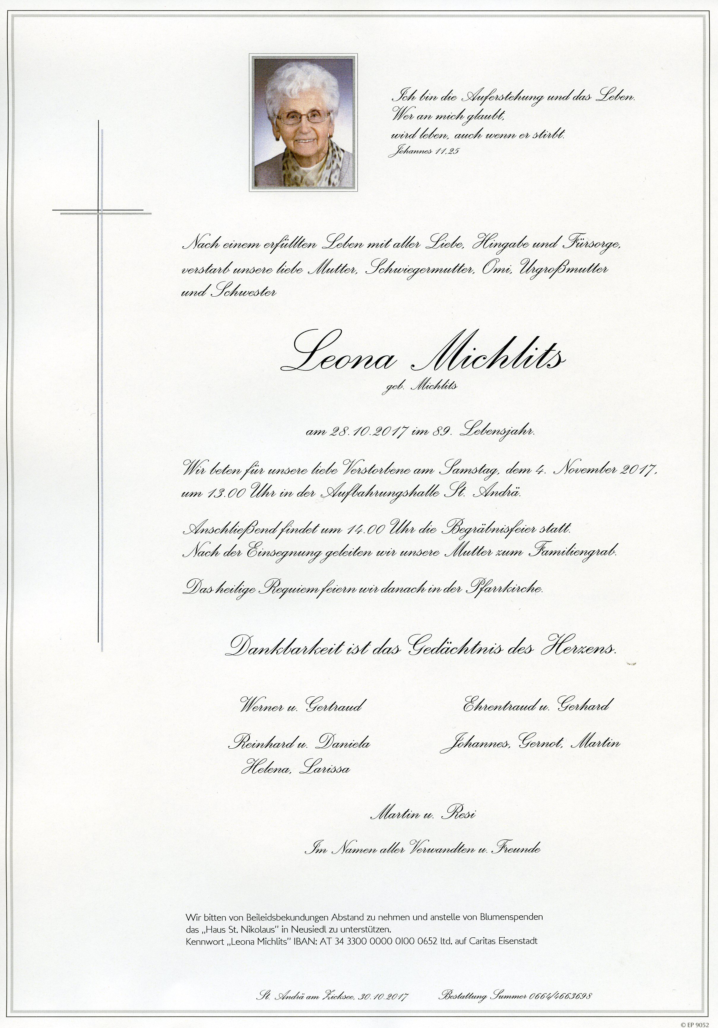 Michlits Leona aus 7161 St. Andrä am Zicksee, gestorben am 28. Oktober 2017