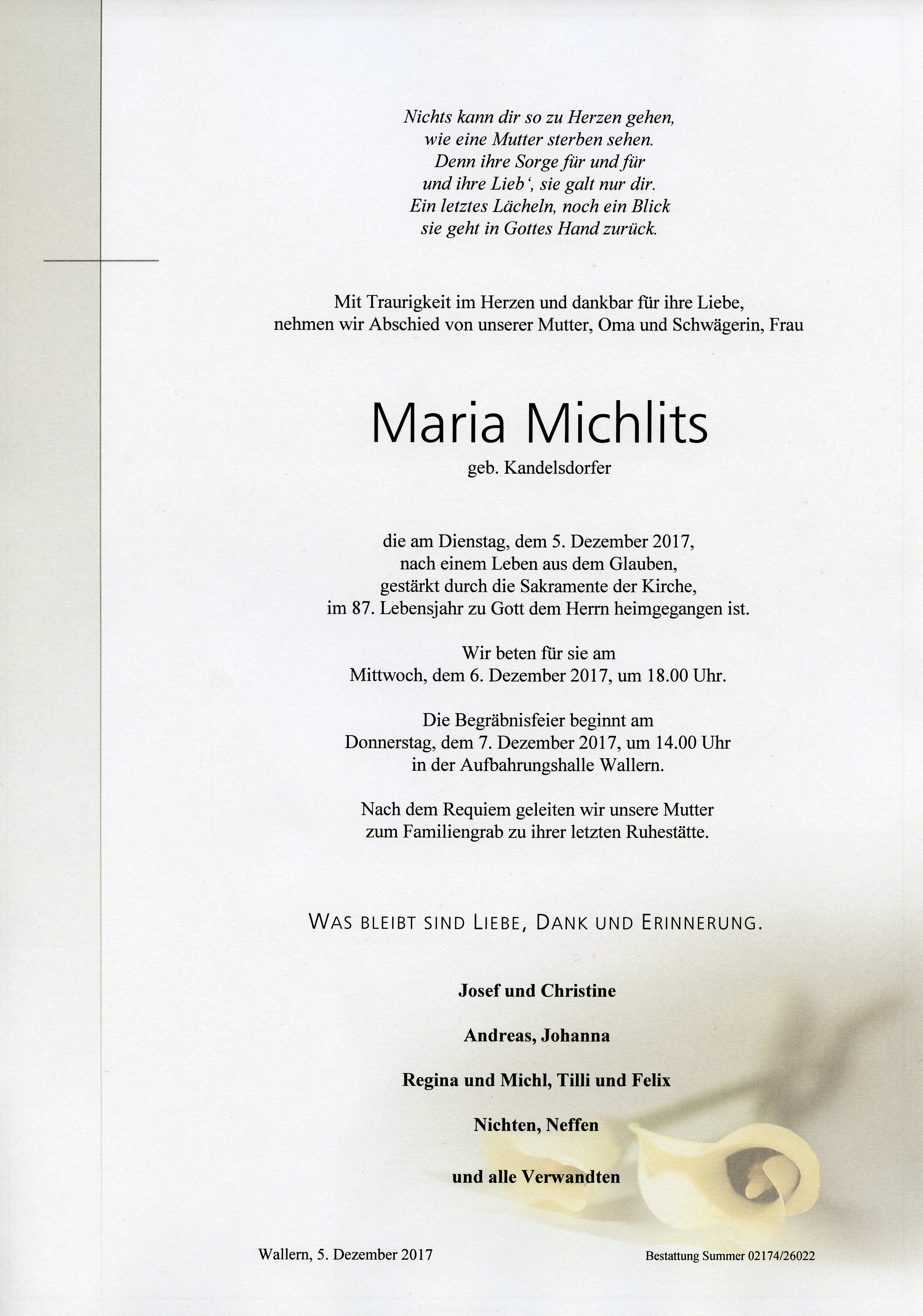 Michlits Maria aus 7151 Wallern, gestorben am 5. Dezember 2017