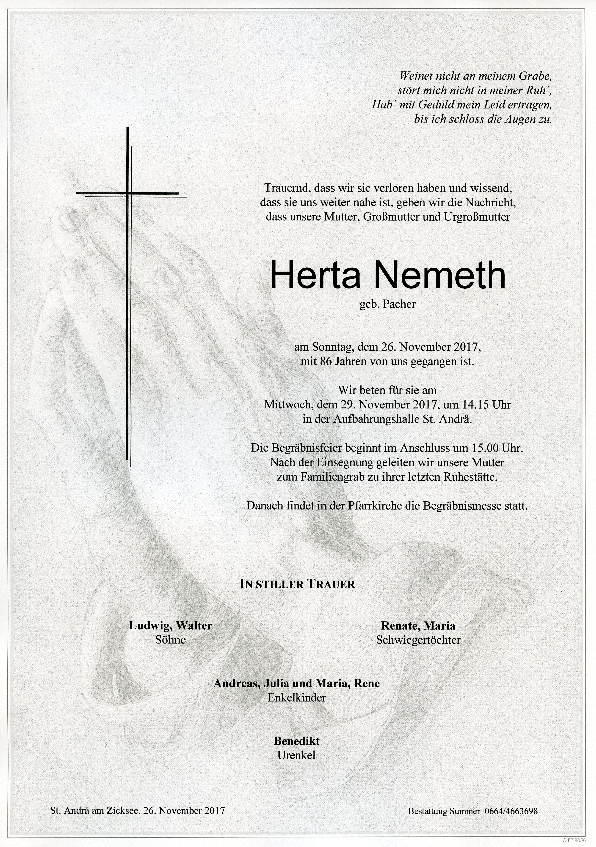 Nemeth Herta aus 7161 St. Andrä am Zicksee, gestorben am 26. November 2017
