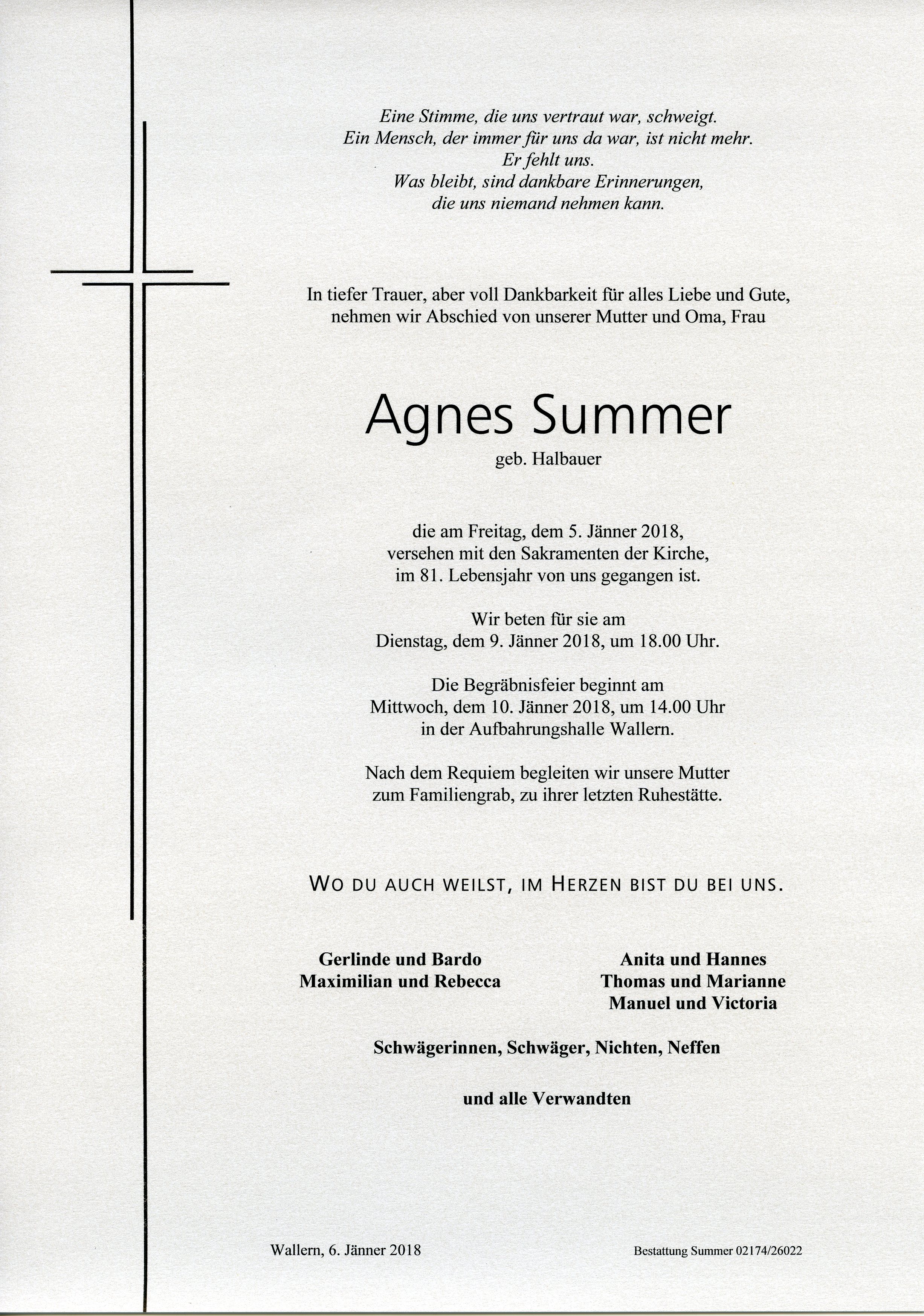 Summer Agnes aus 7151 Wallern, gestorben am 5. Jänner 2018