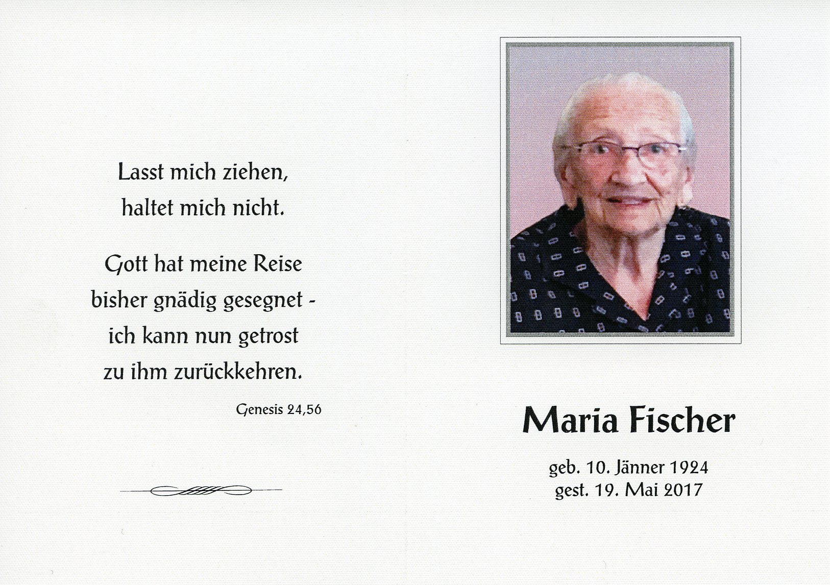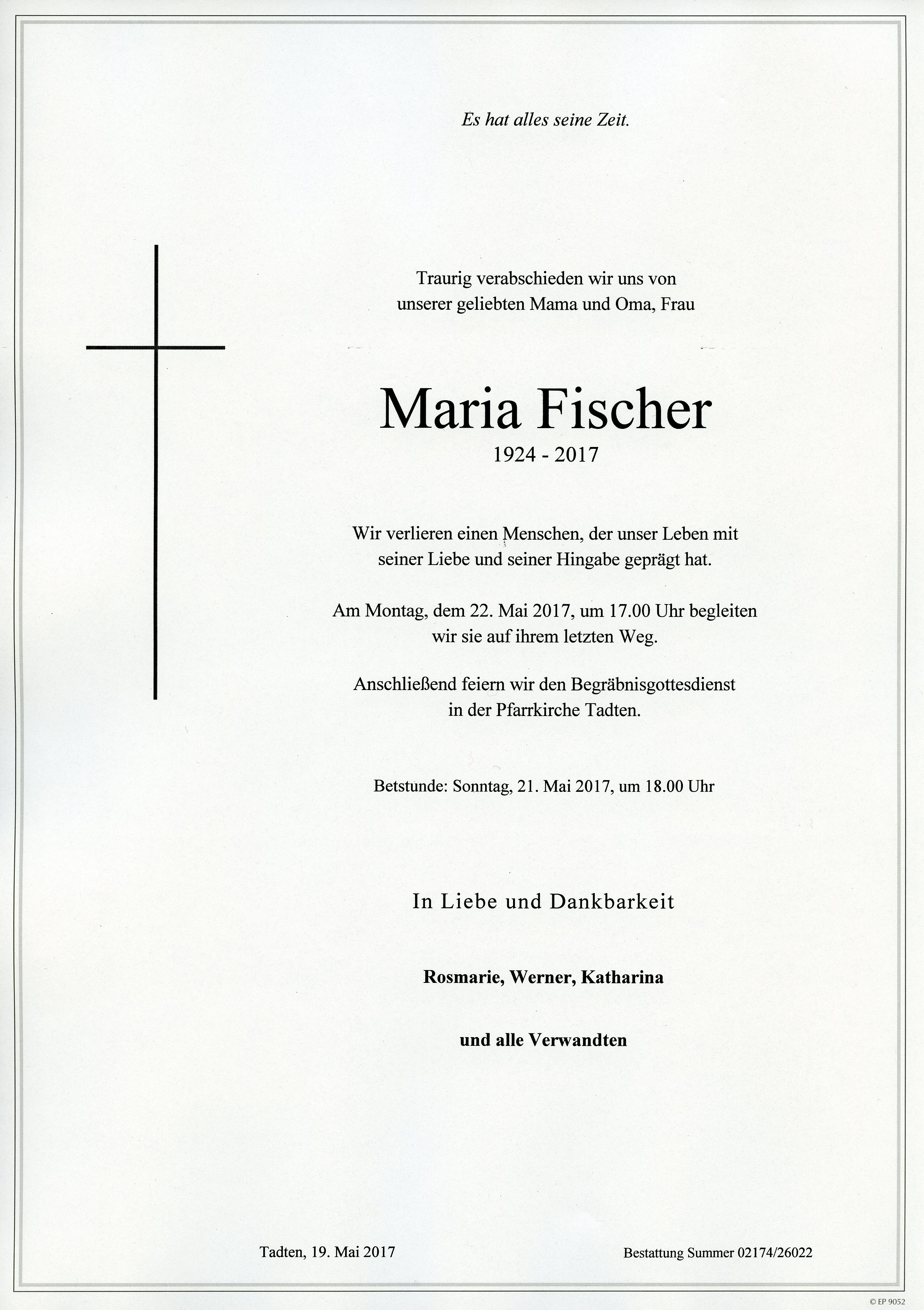 Fischer Maria aus 7162 Tadten, gestorben am 19. Mai 2017