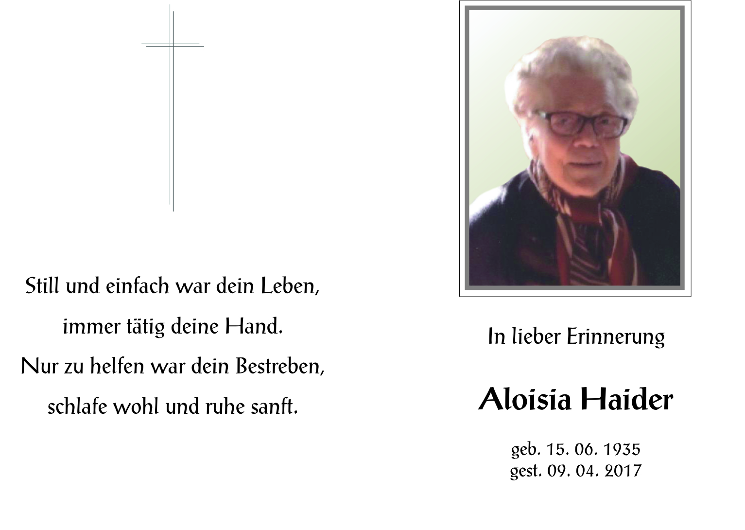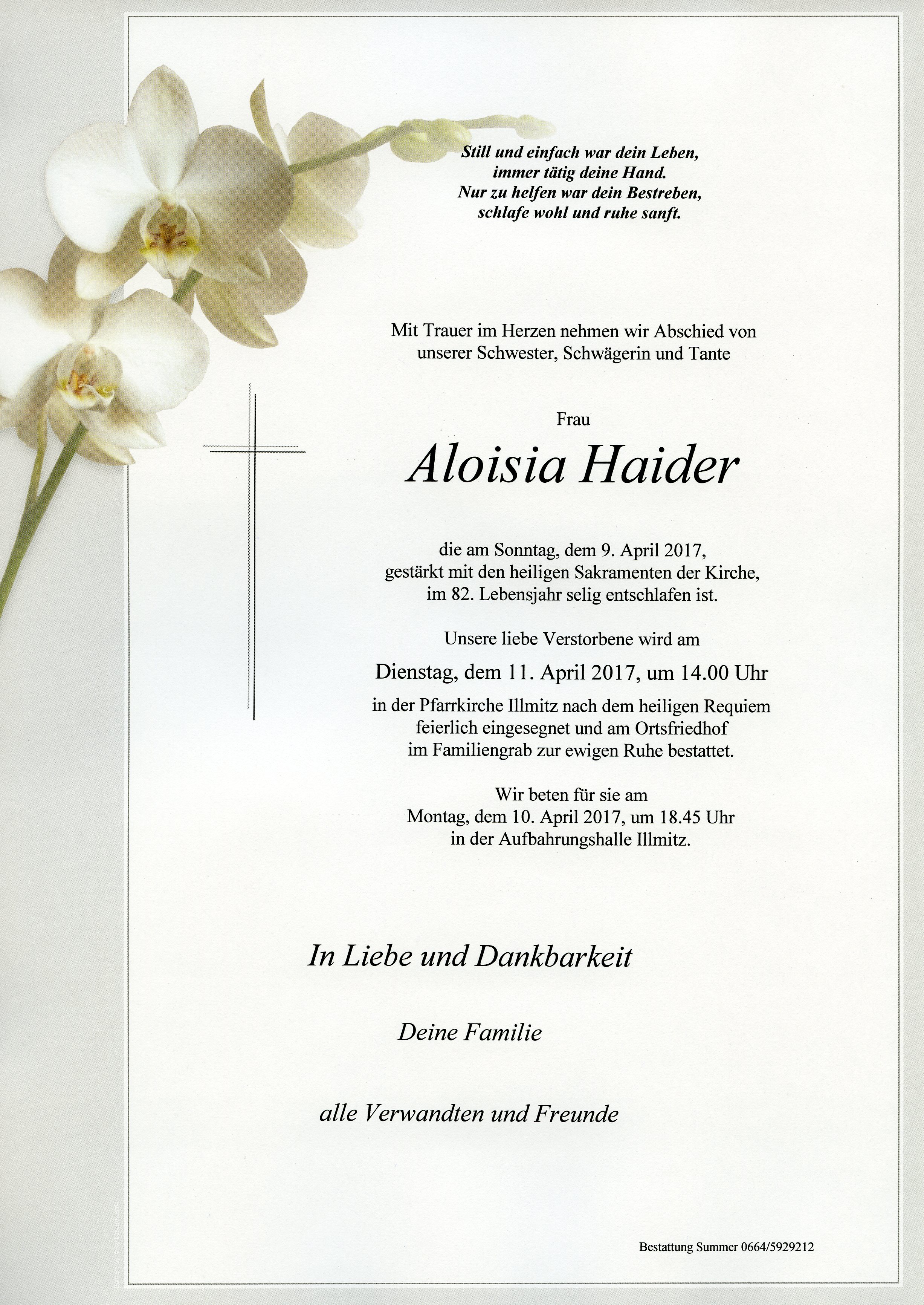 Haider Aloisia aus 7142 Illmitz, gestorben am 9. April 2017