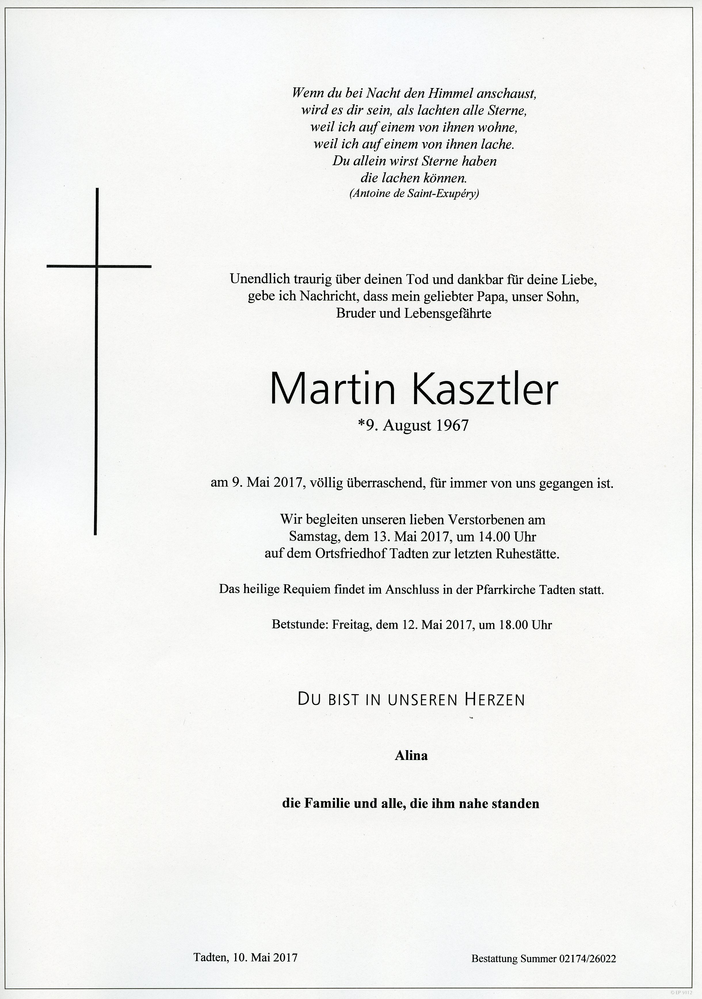 Kasztler Martin aus 7162 Tadten, gestorben am 9. Mai 2017