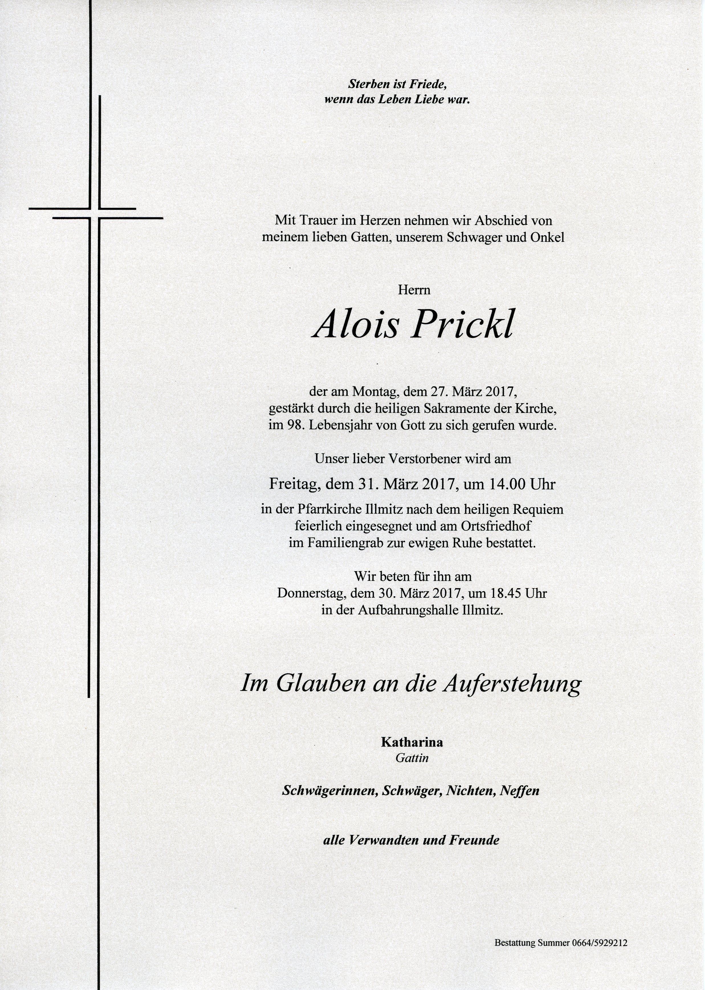 Prickl Alois aus 7142 Illmitz, gestorben am 27. März 2017