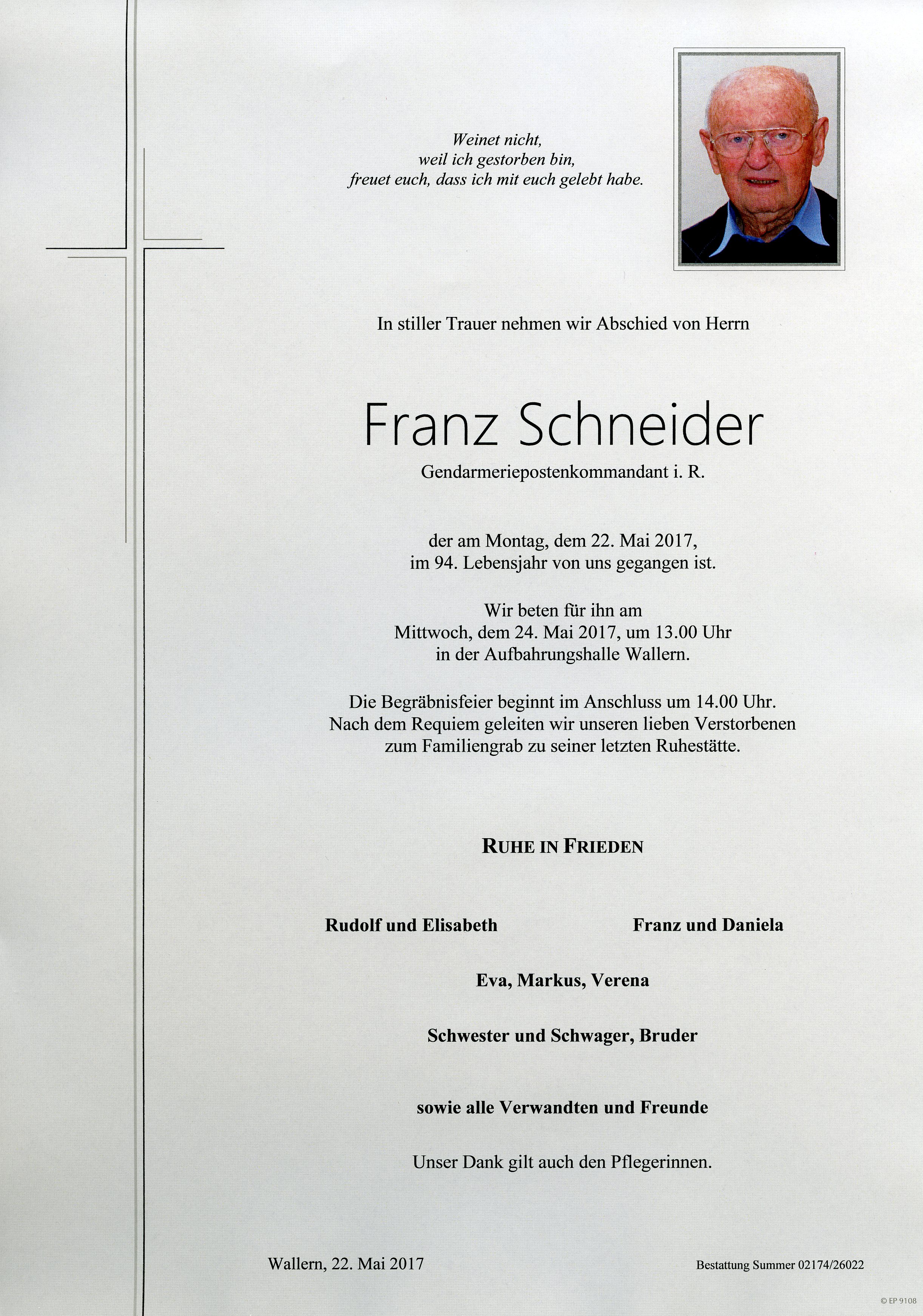 Schneider Franz aus 7151 Wallern, gestorben am 22. Mai 2017