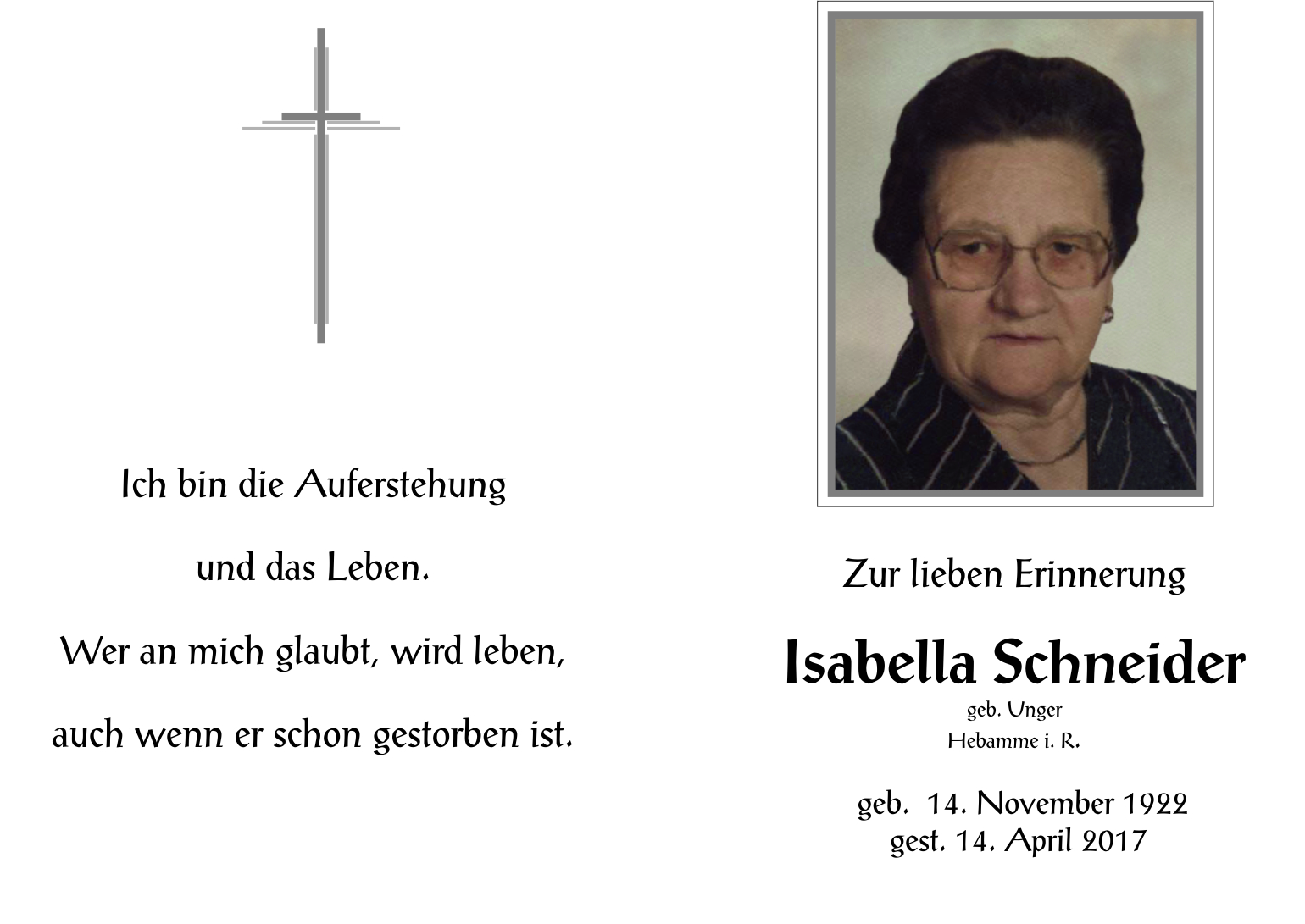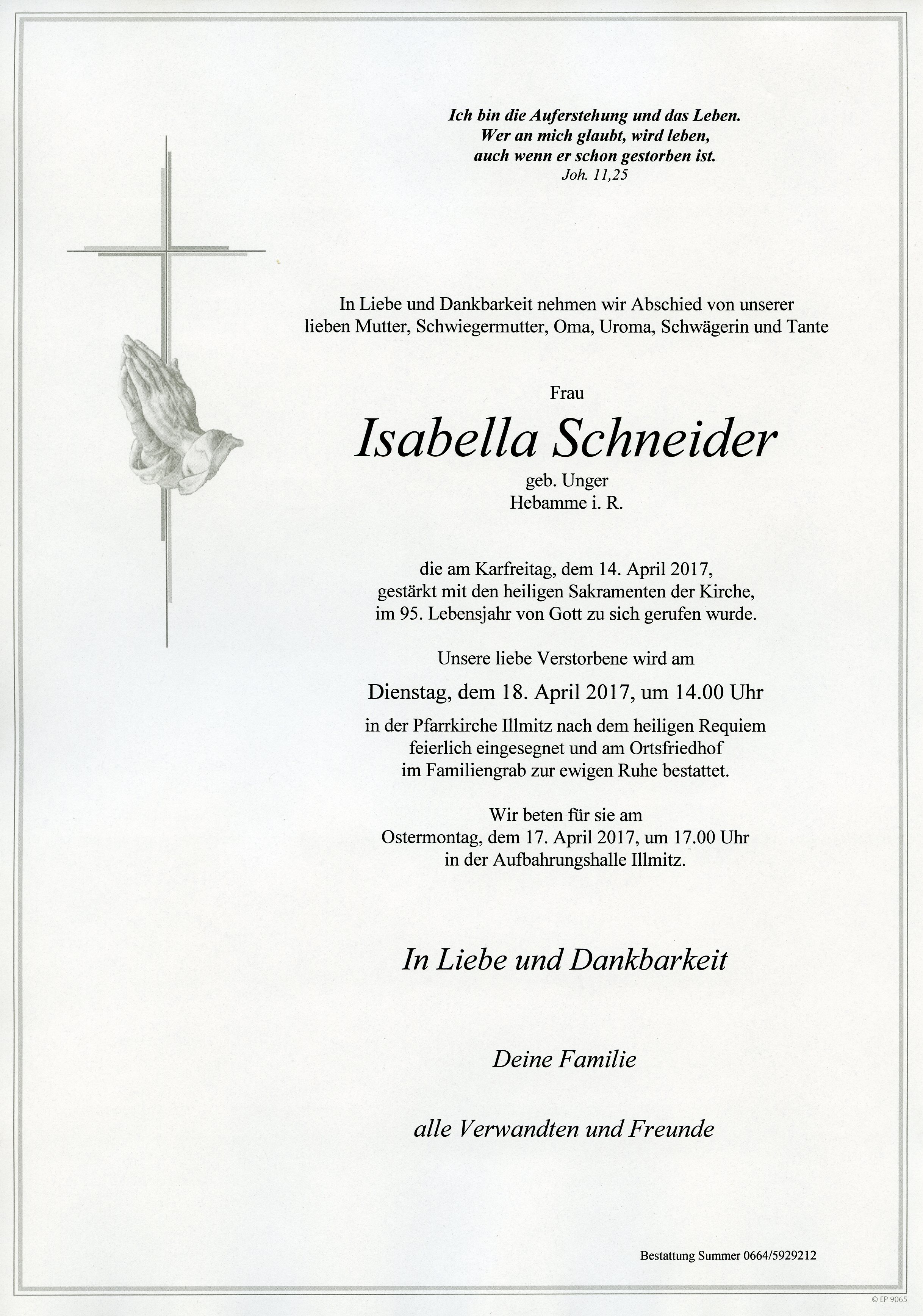 Schneider Isabella aus 7142 Illmitz, gestorben am 14. April 2017