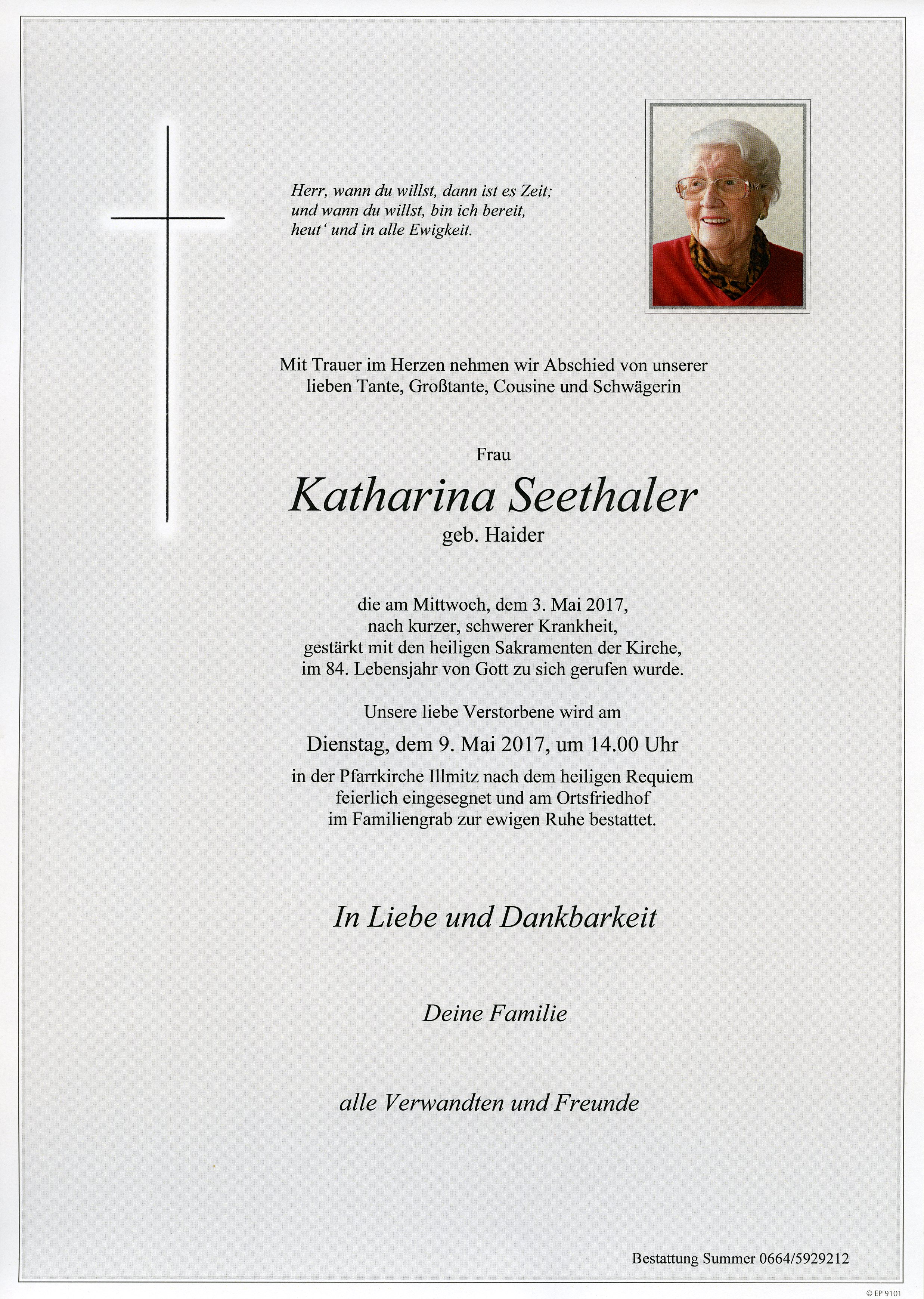 Seethaler Katharina aus 7142 Illmitz, gestorben am 3. Mai 2017