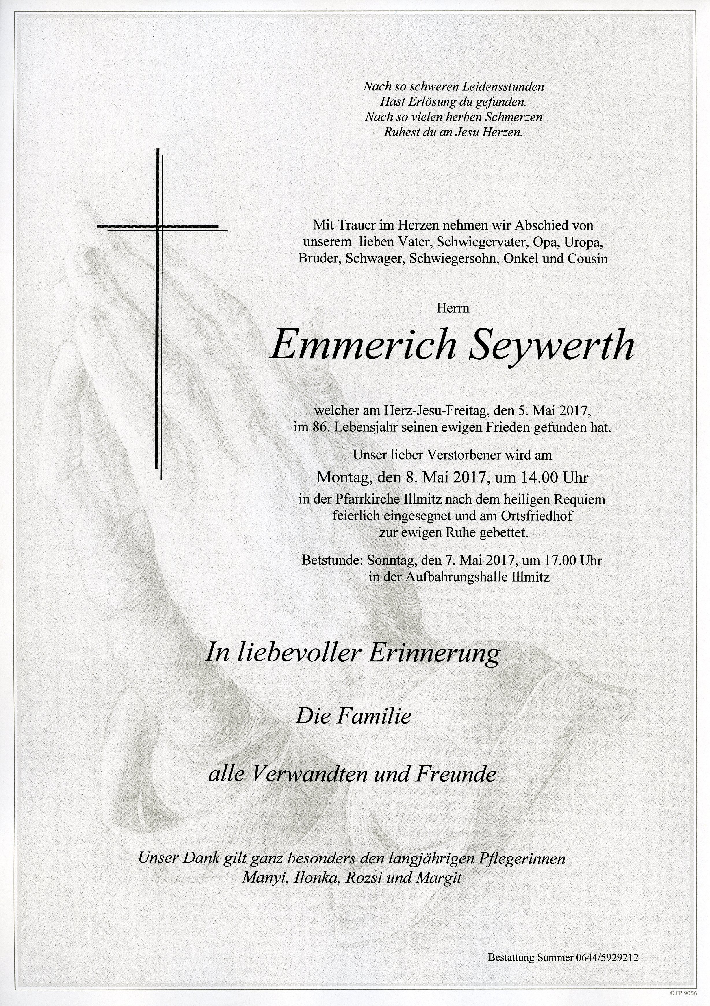 Seywerth Emmerich aus 7142 Illmitz, gestorben am 5. Mai 2017