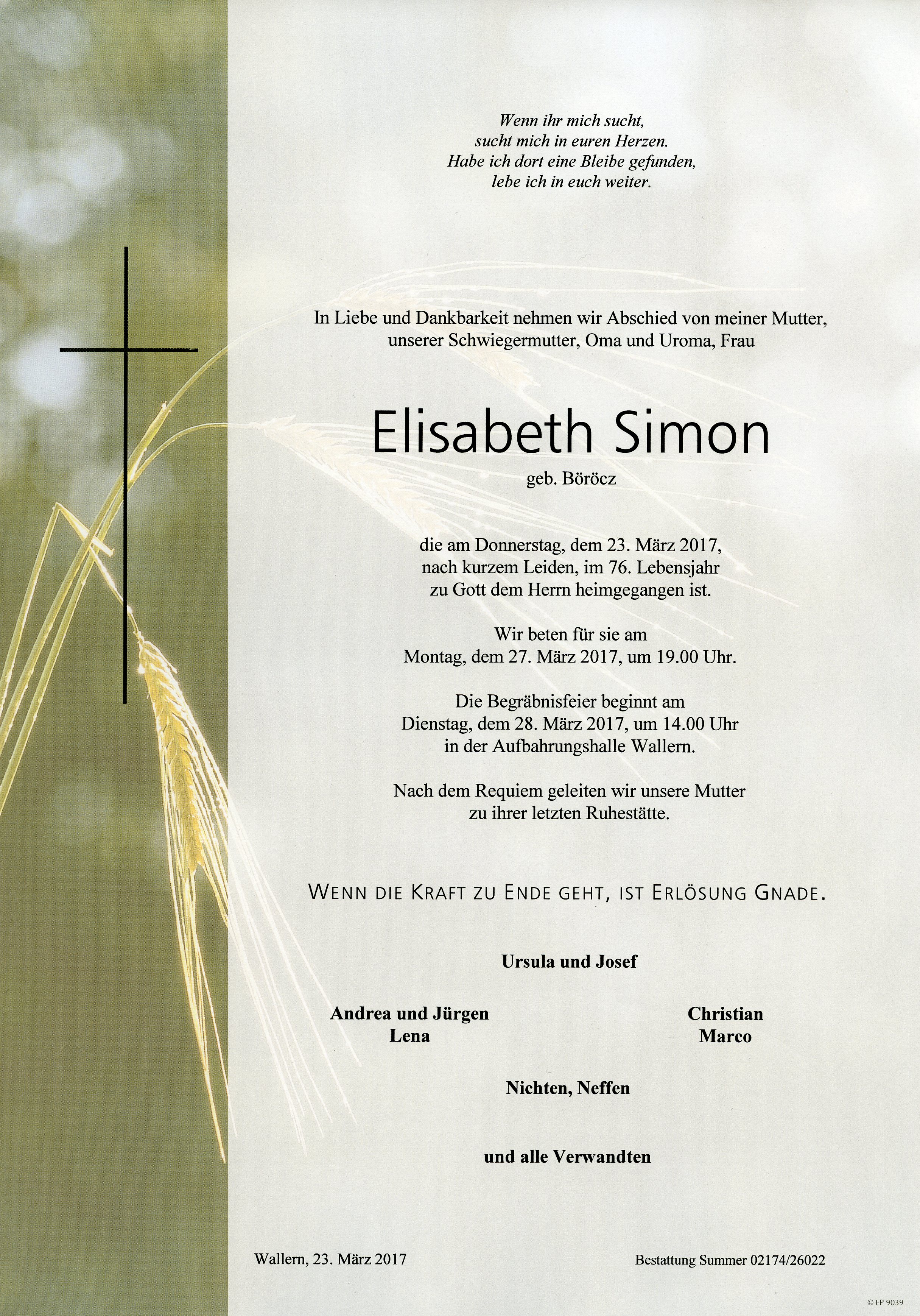Simon Elisabeth aus 7151 Wallern, gestorben am 23. März 2017