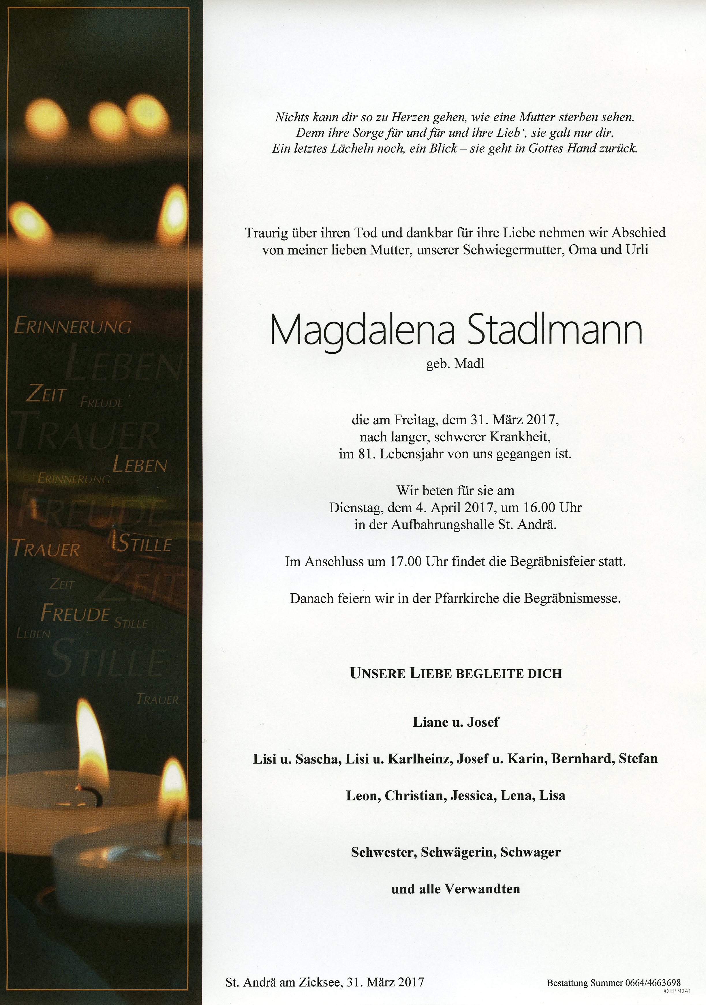 Stadlmann Magdalena aus 7161 St. Andrä am Zicksee, gestorben am 31. März 2017