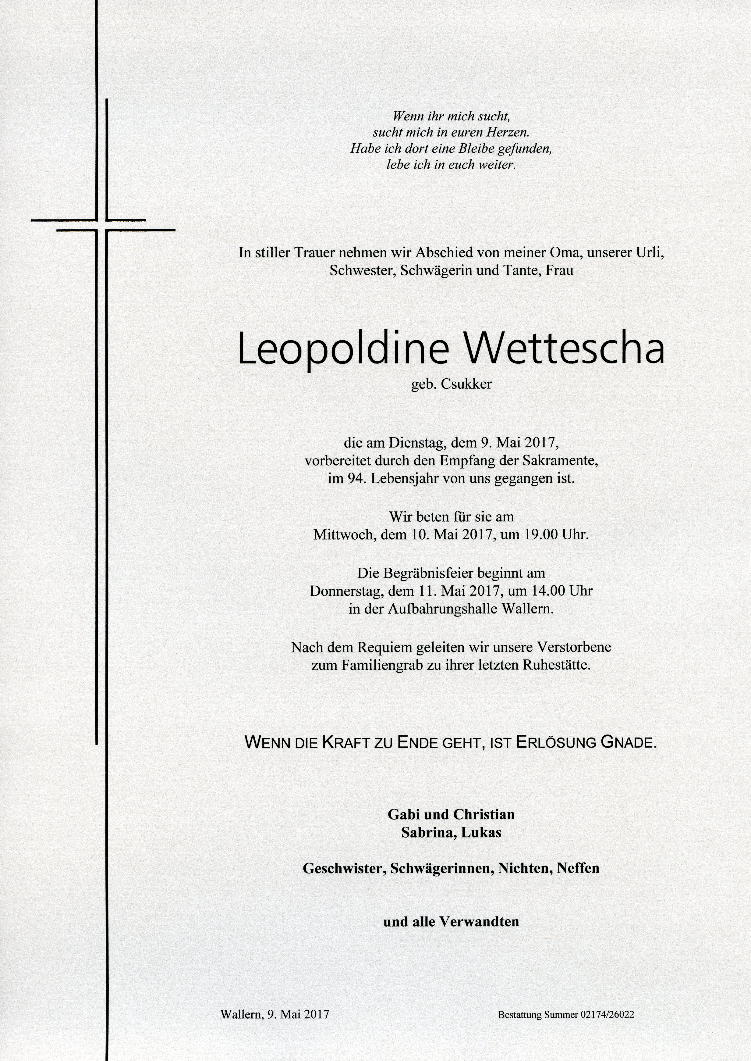 Wettescha Leopoldine aus 7151 Wallern, gestorben am 9. Mai 2017