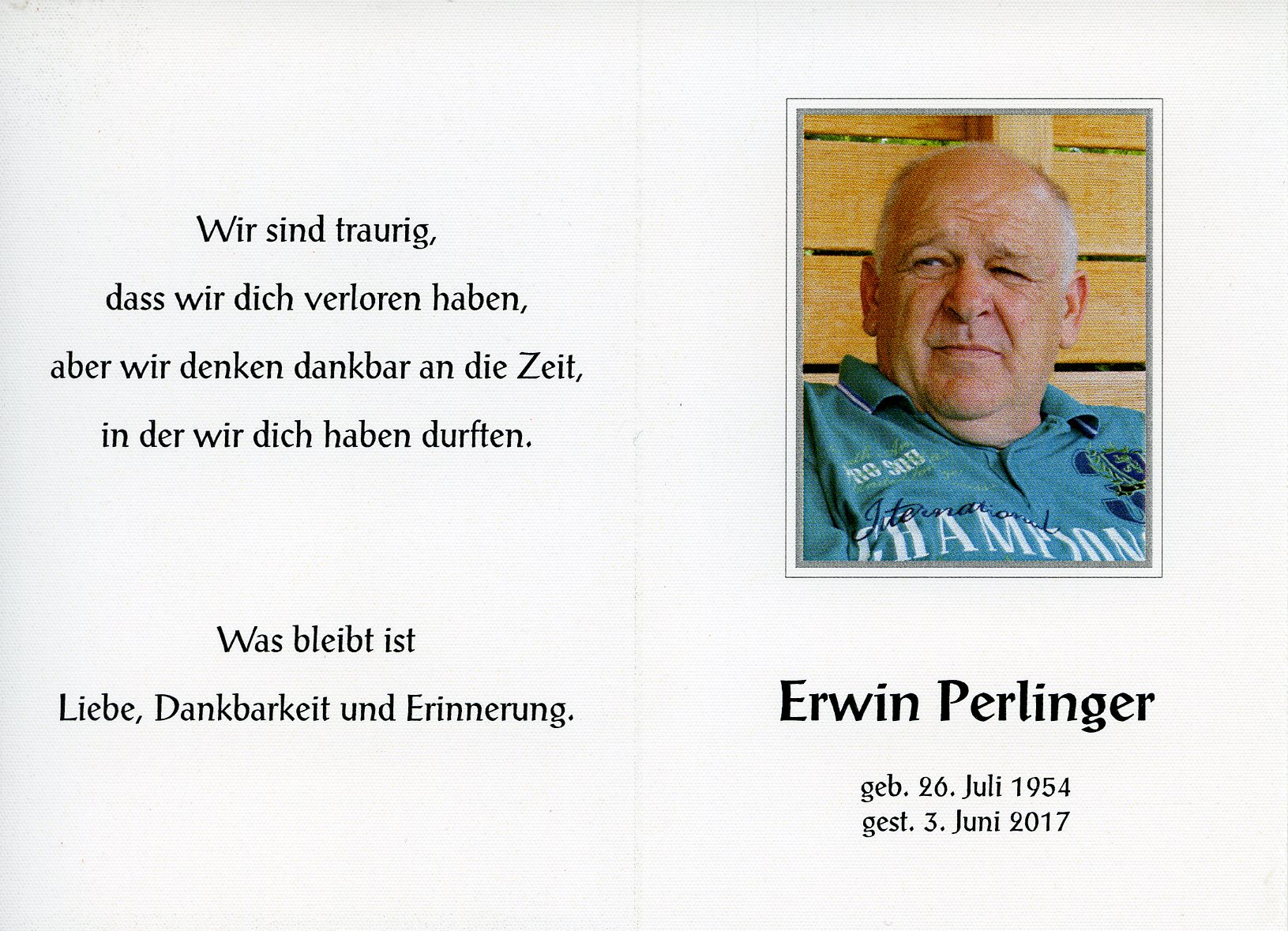 Perlinger Erwin aus 7151 Wallern, gestorben am 3. Juni 2017