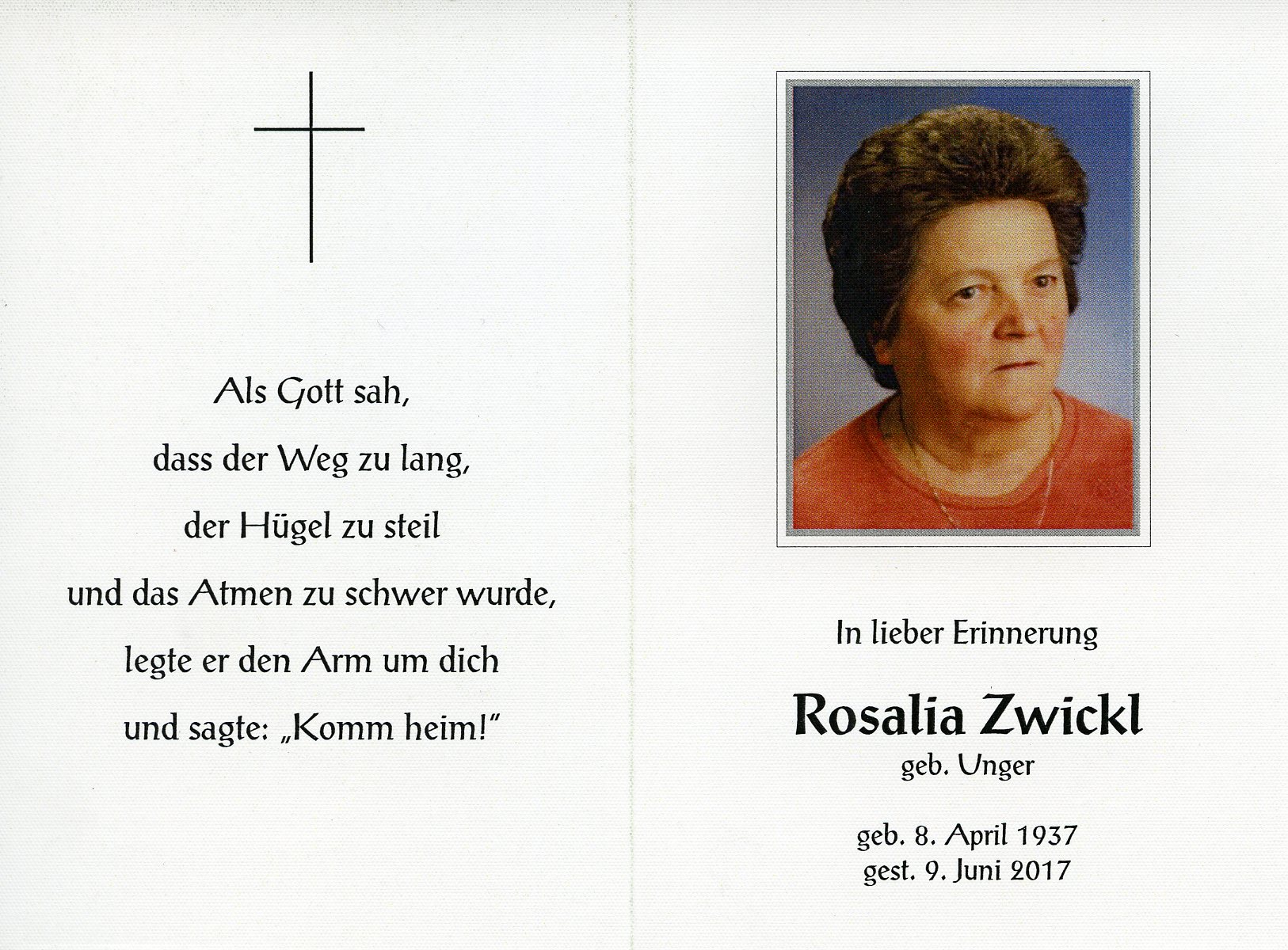 Zwickl Rosalia aus 7162 Tadten, gestorben am 9. Juni 2017