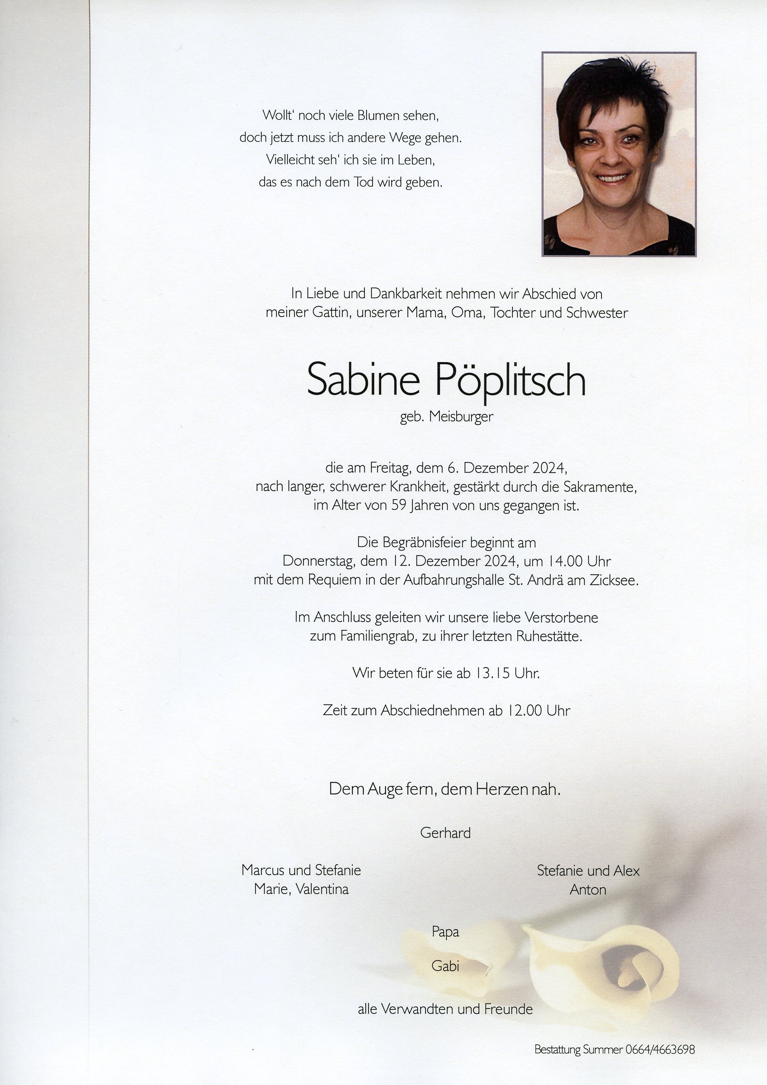 Pöplitsch Sabine aus 7161 St. Andrä am Zicksee, gestorben am 6. Dezember 2024