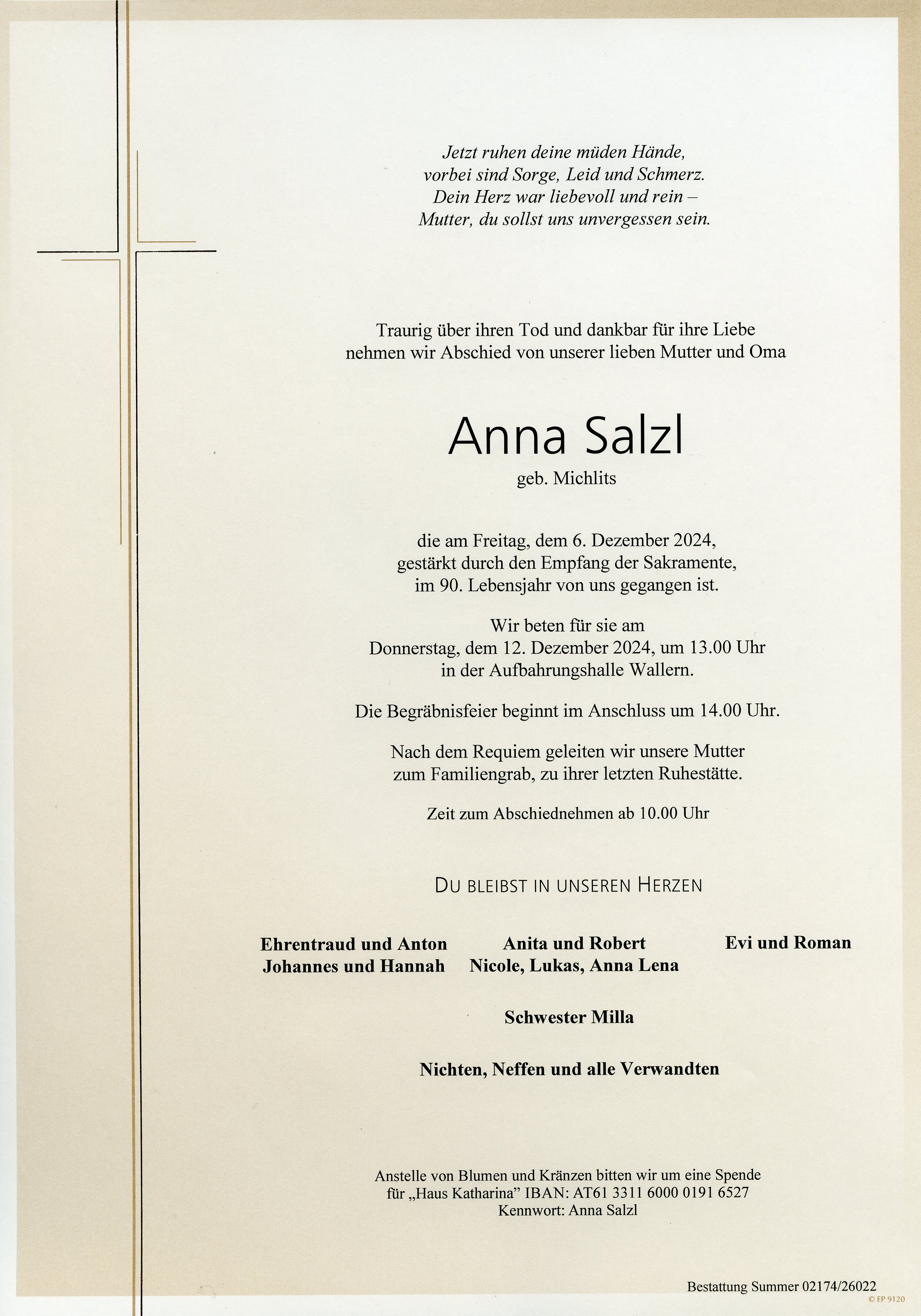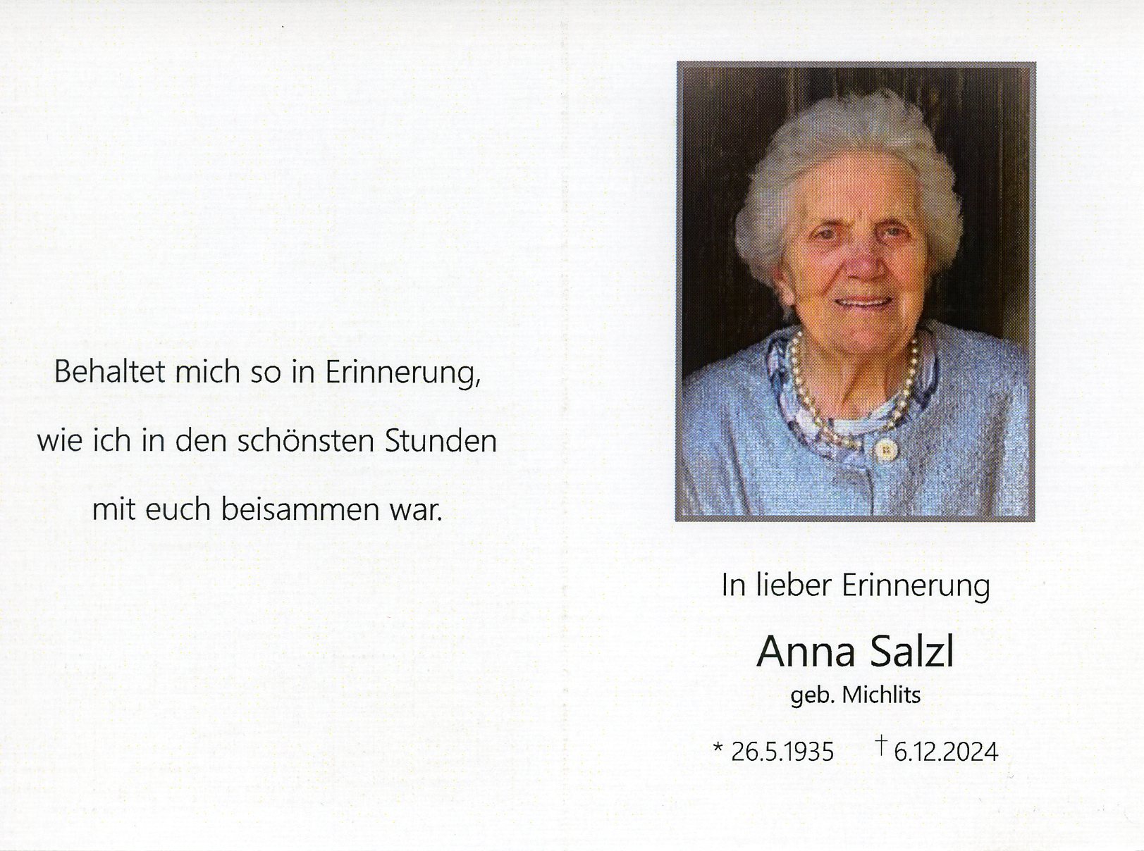 Salzl Anna aus 7151 Wallern, gestorben am 6. Dezember 2024