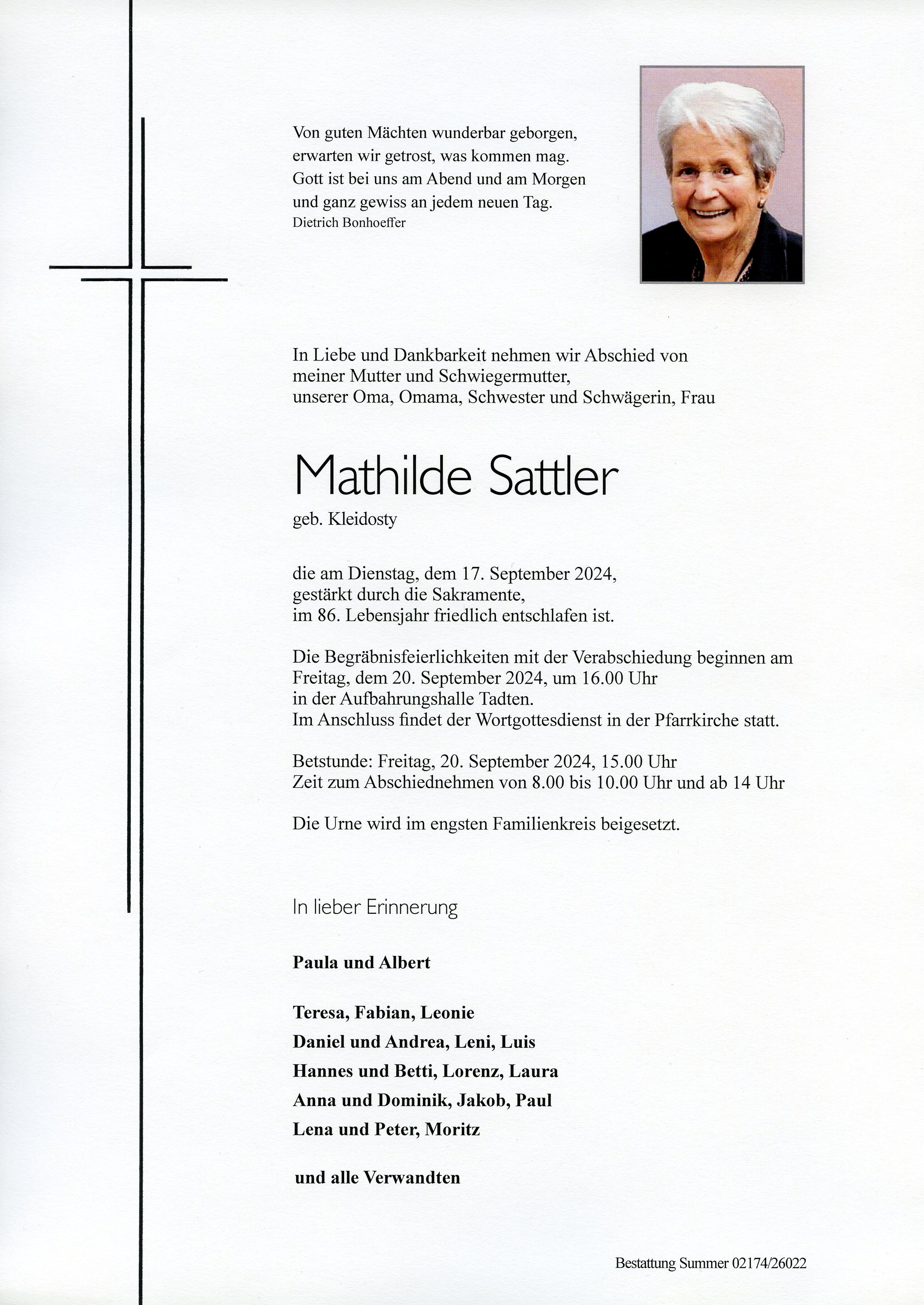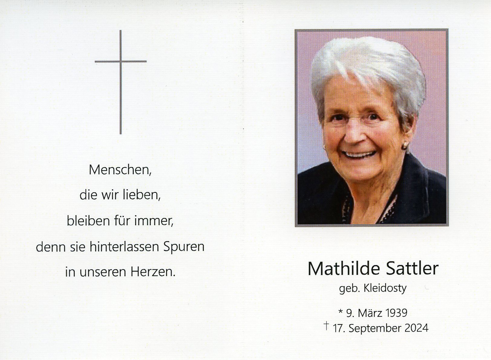 Sattler Mathilde aus 7162 Tadten, gestorben am 17. September 2024