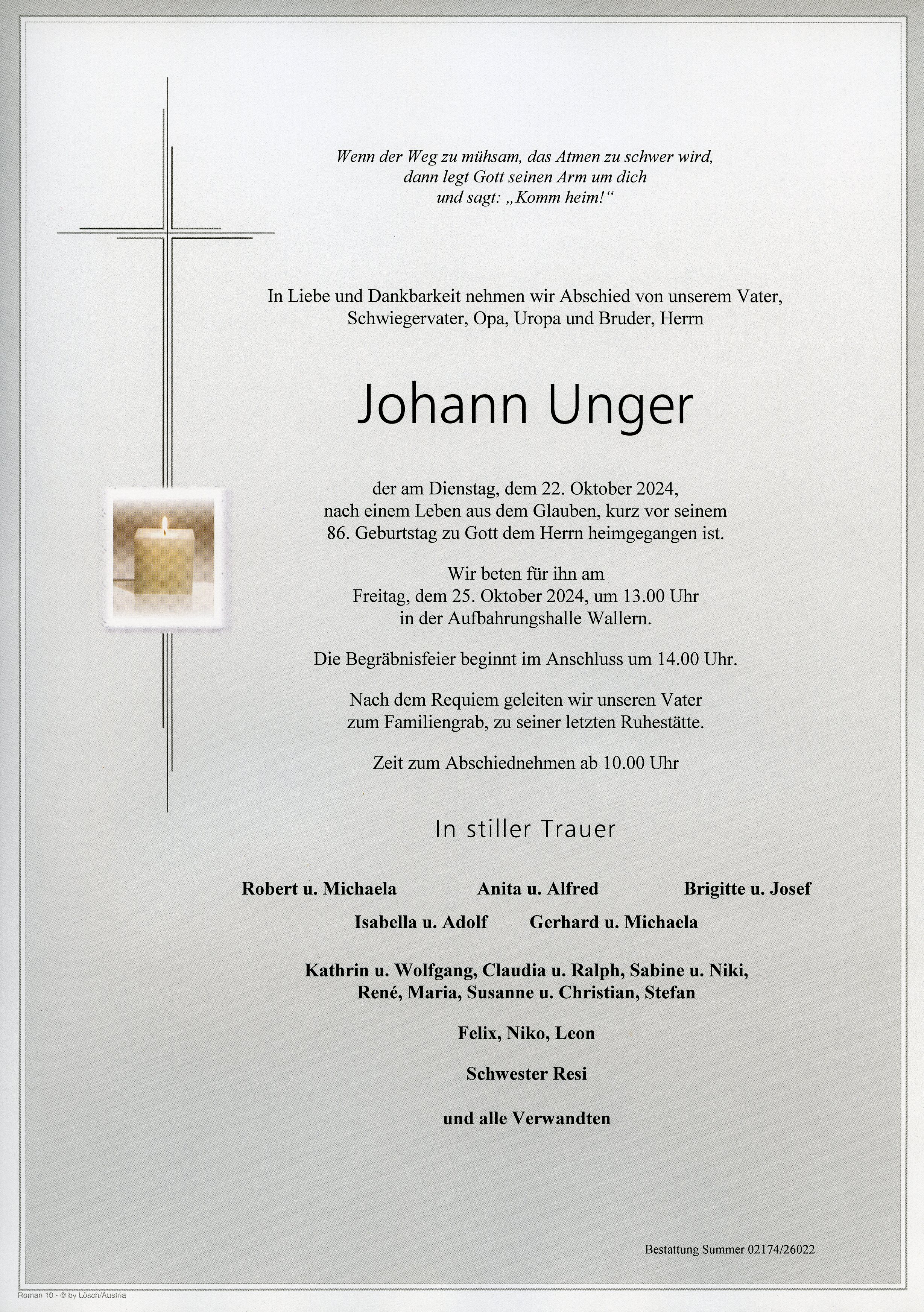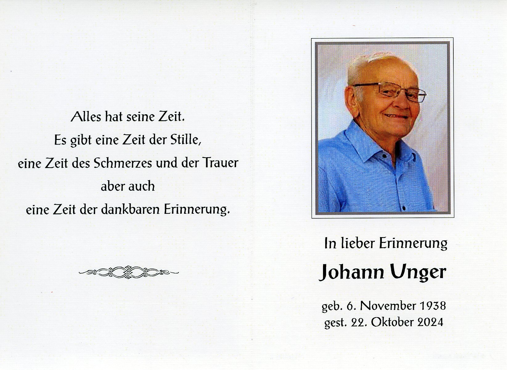 Unger Johann aus 7151 Wallern, gestorben am 22. Oktober 2024