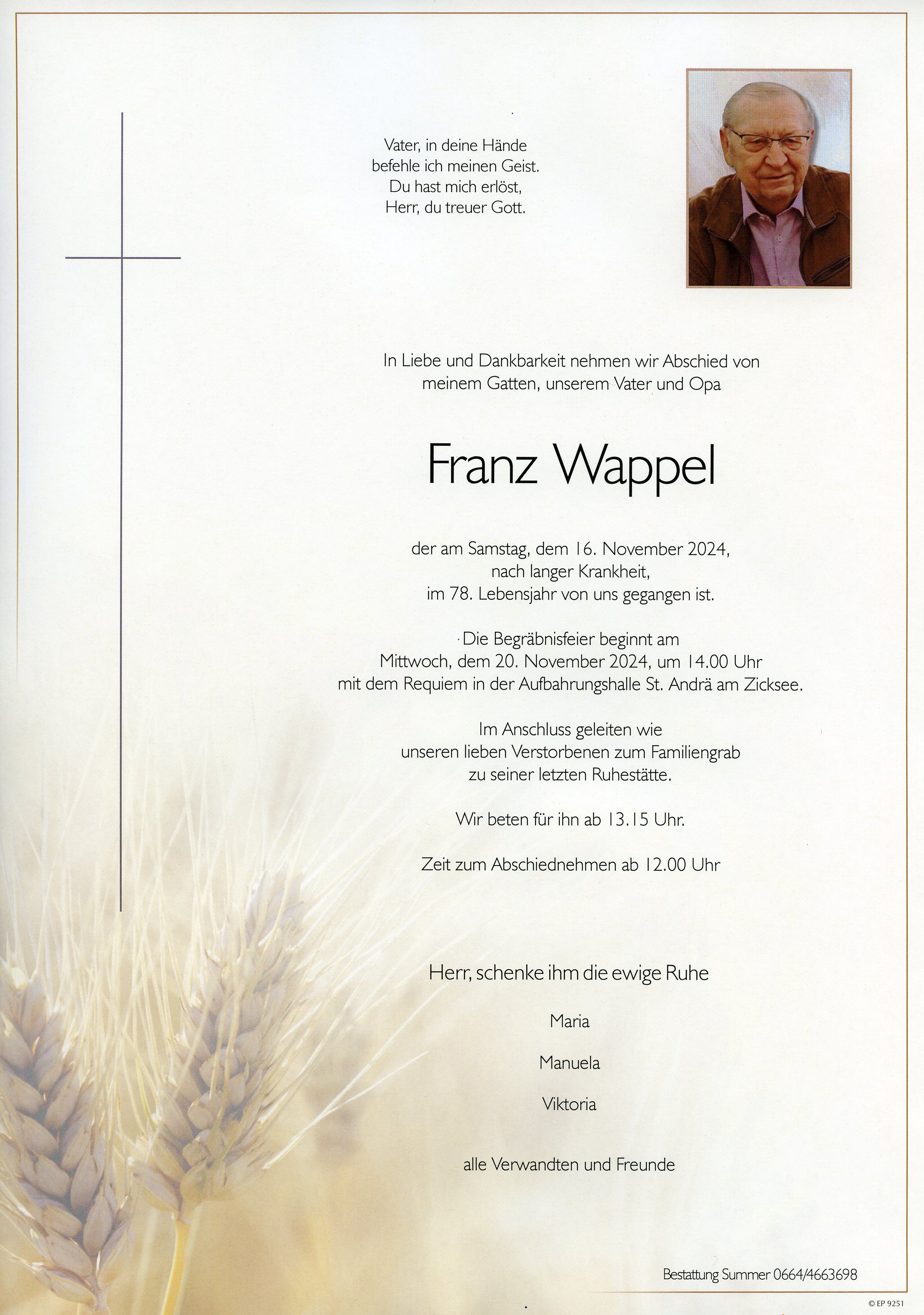 Wappel Franz aus 7161 St. Andrä am Zicksee, gestorben am 16. November 2024