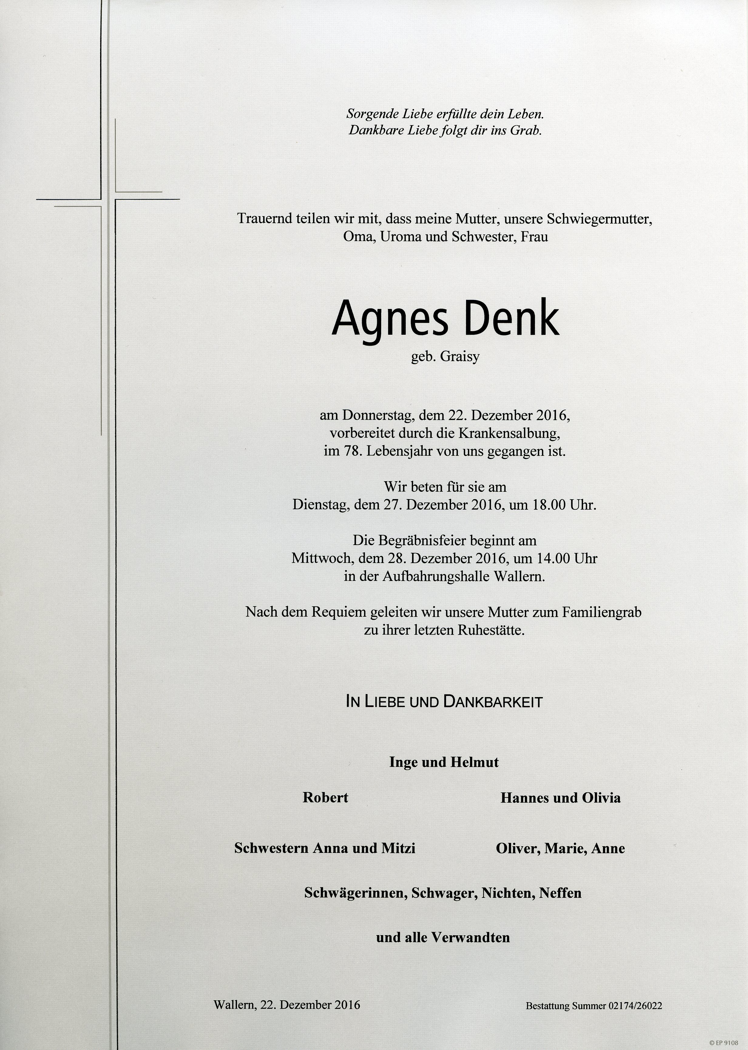 Denk Agnes aus 7151 Wallern, gestorben am 22. Dezember 2016