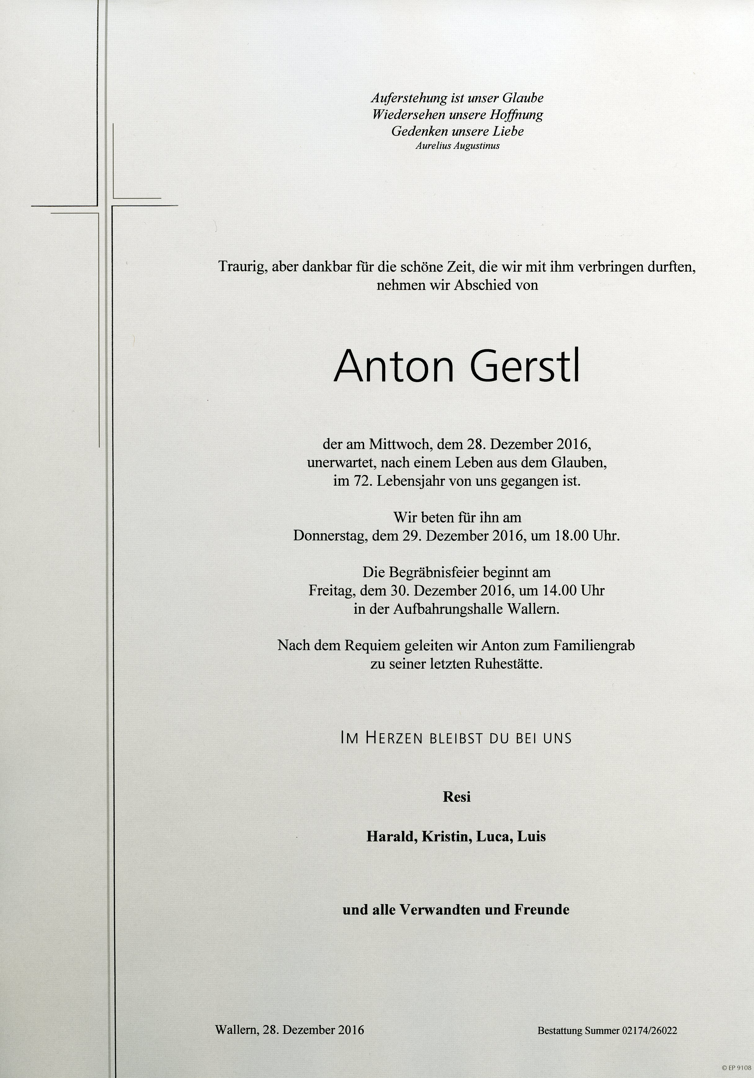 Gerstl Anton aus 7151 Wallern, gestorben am 28. Dezember 2016