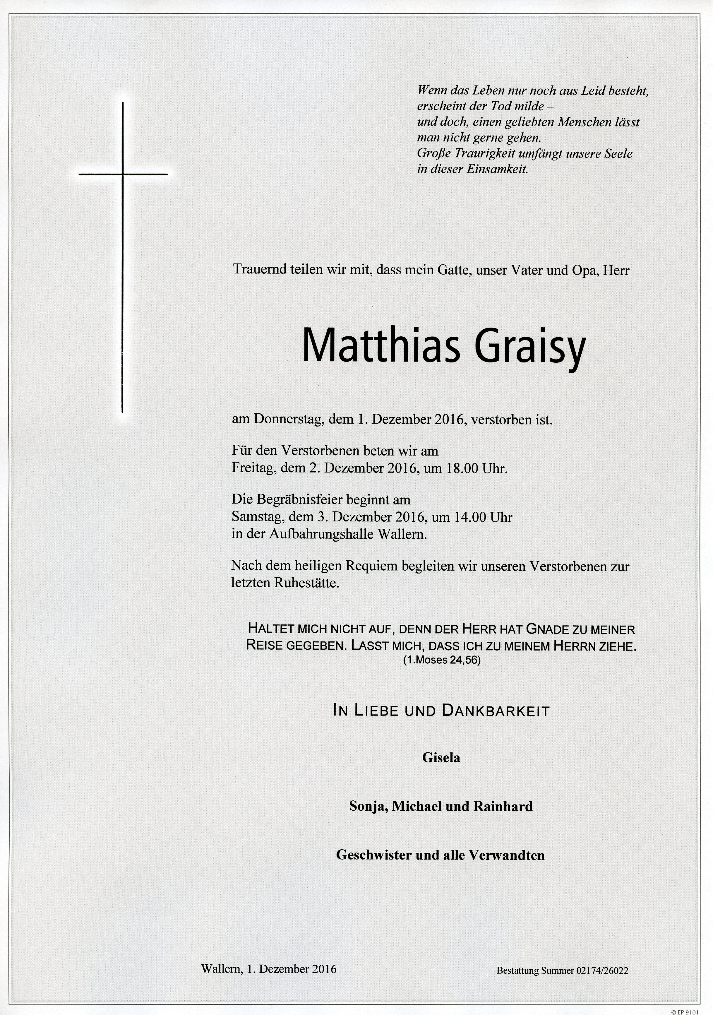 Graisy Matthias aus 7151 Wallern, gestorben am 1. Dezember 2016