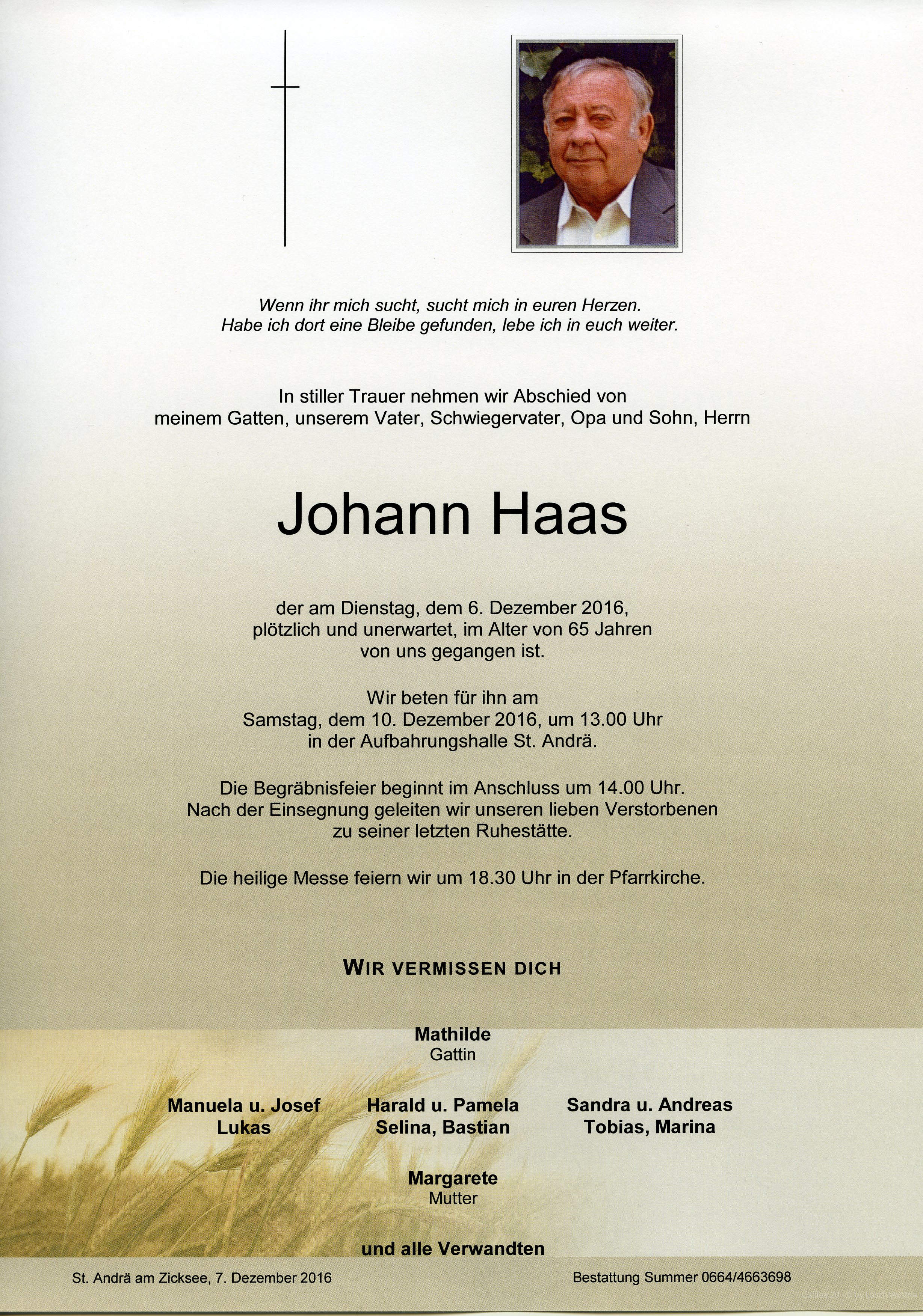 Haas Johann aus 7161 St. Andrä am Zicksee, gestorben am 6. Dezember 2016