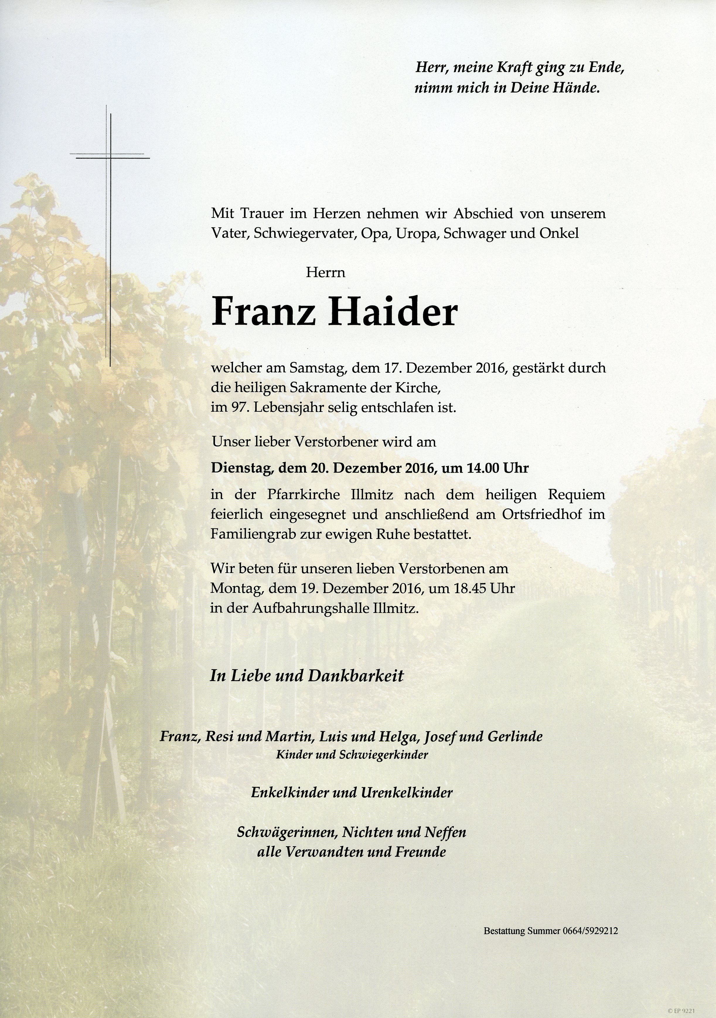 Haider Franz aus 7142 Illmitz, gestorben am 17. Dezember 2016