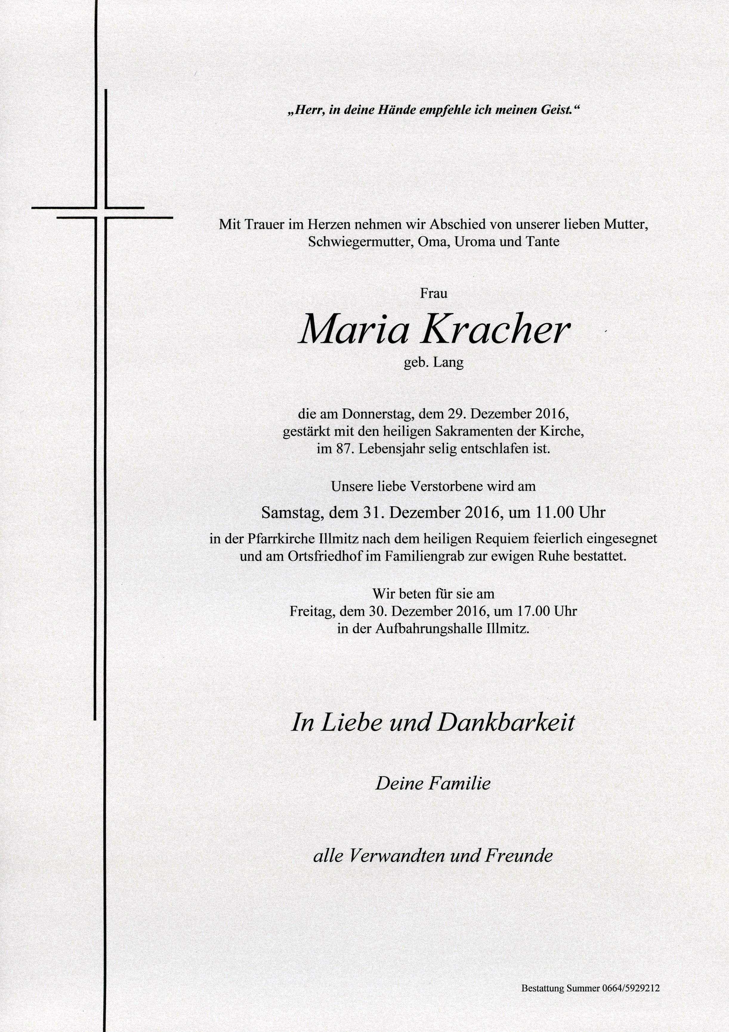 Kracher Maria aus 7142 Illmitz, gestorben am 29. Dezember 2016