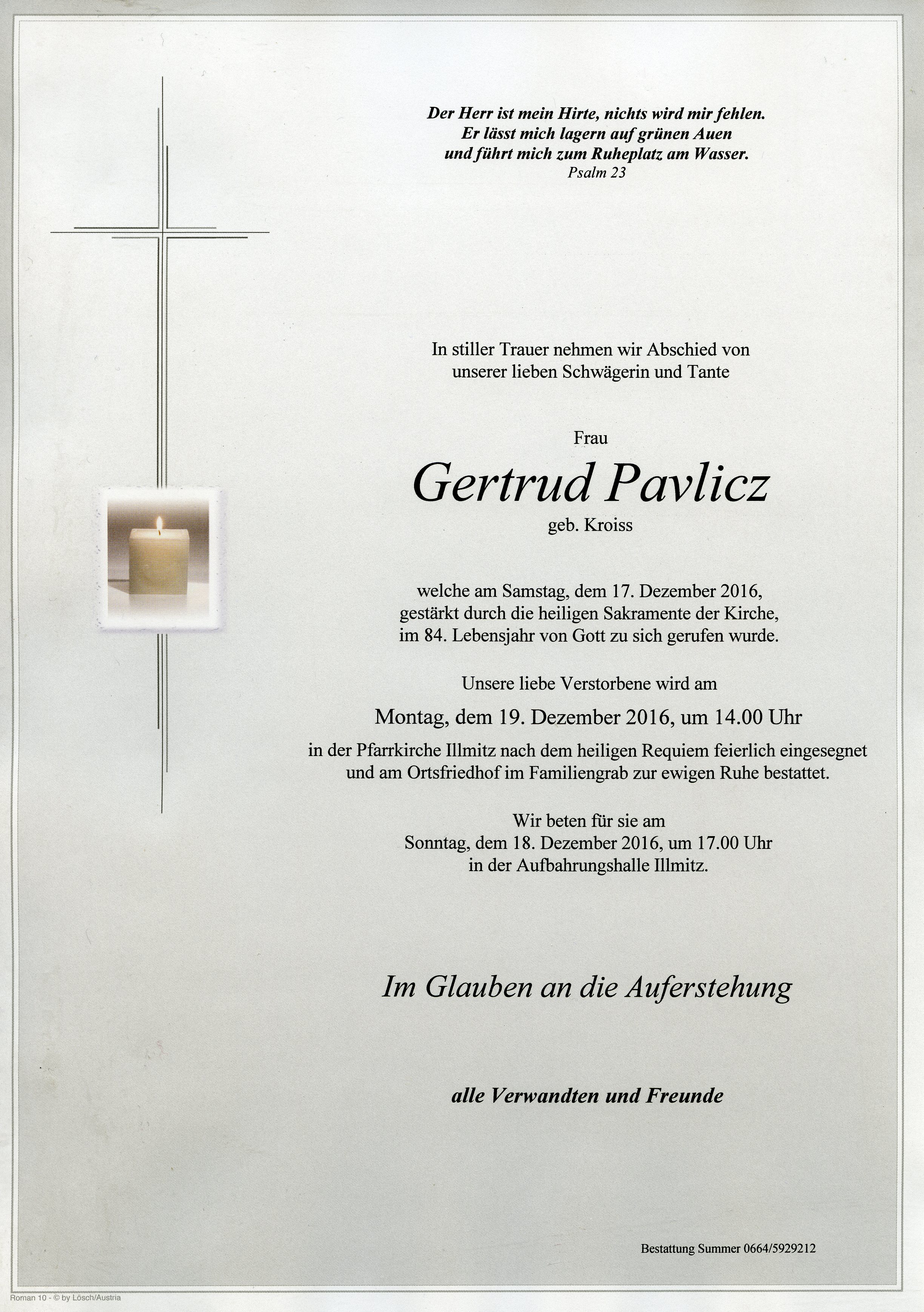 Pavlicz Gertrud aus 7142 Illmitz, gestorben am 17. Dezember 2016