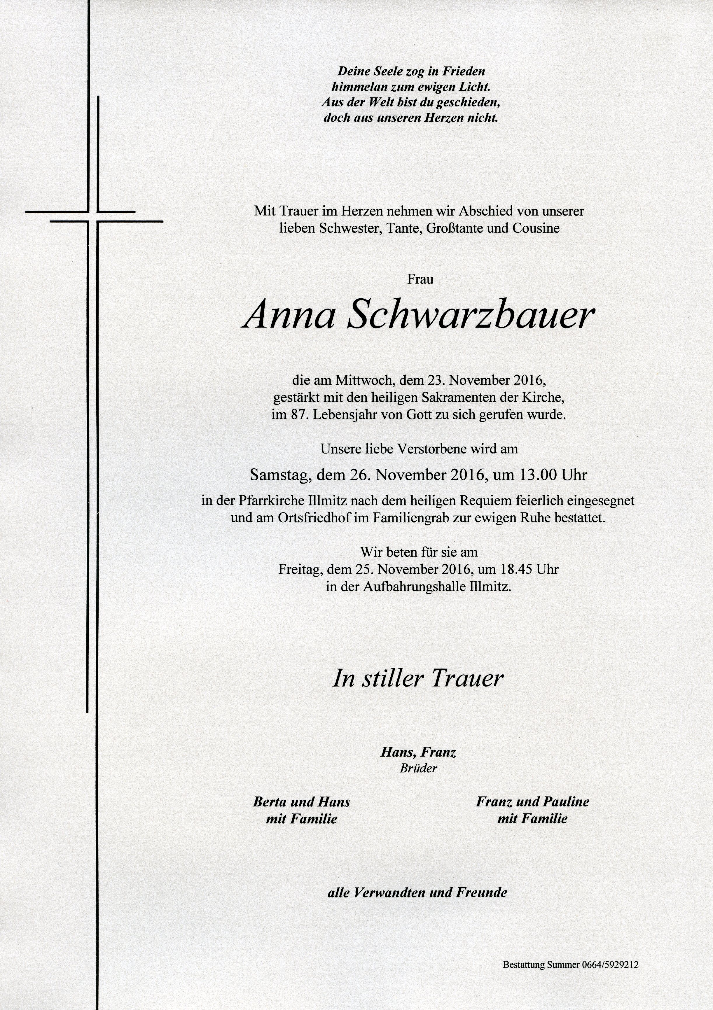 Schwarzbauer Anna aus 7142 Illmitz, gestorben am 23. November 2016