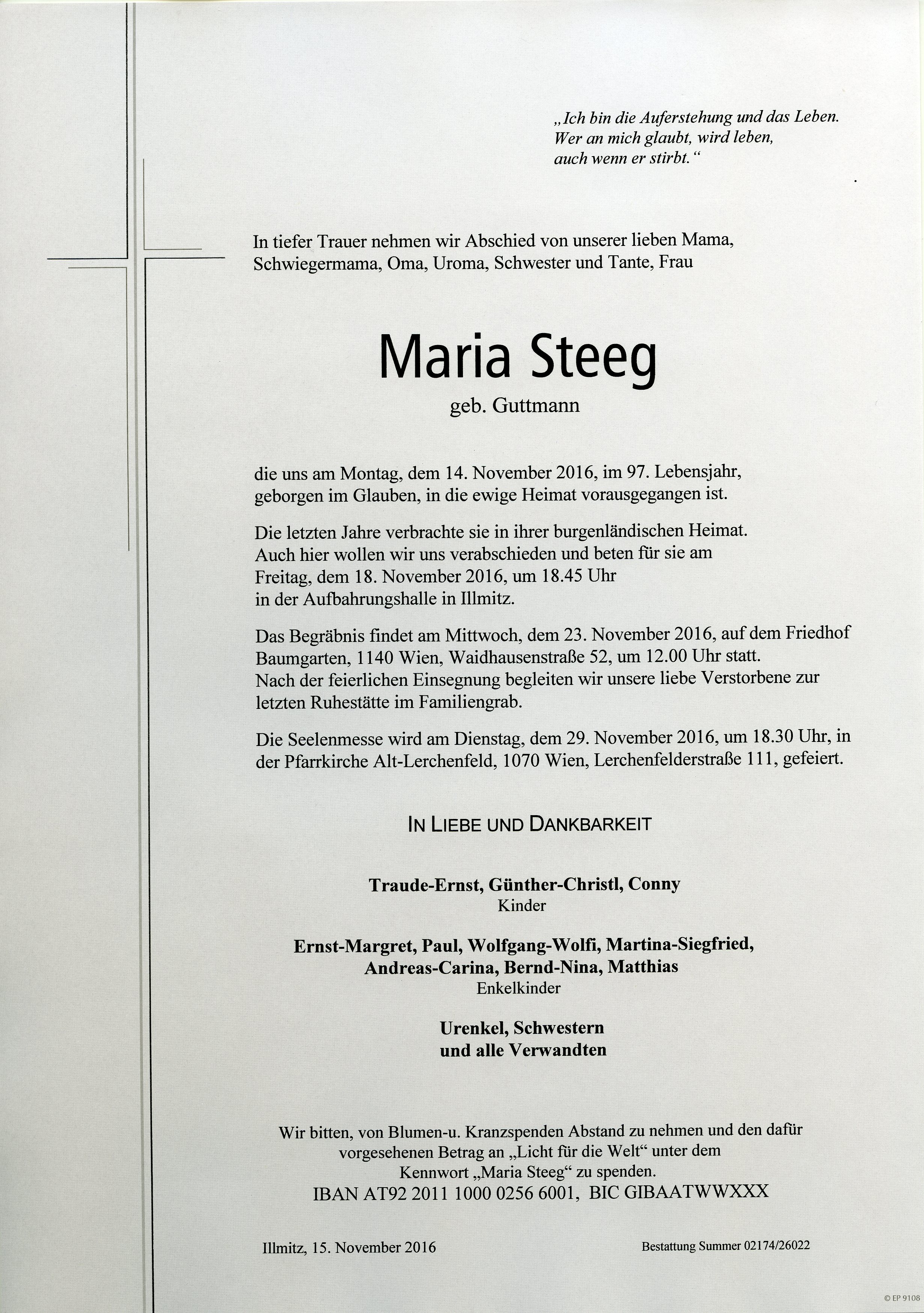 Steeg Maria aus 7142 Illmitz, gestorben am 14. November 2016