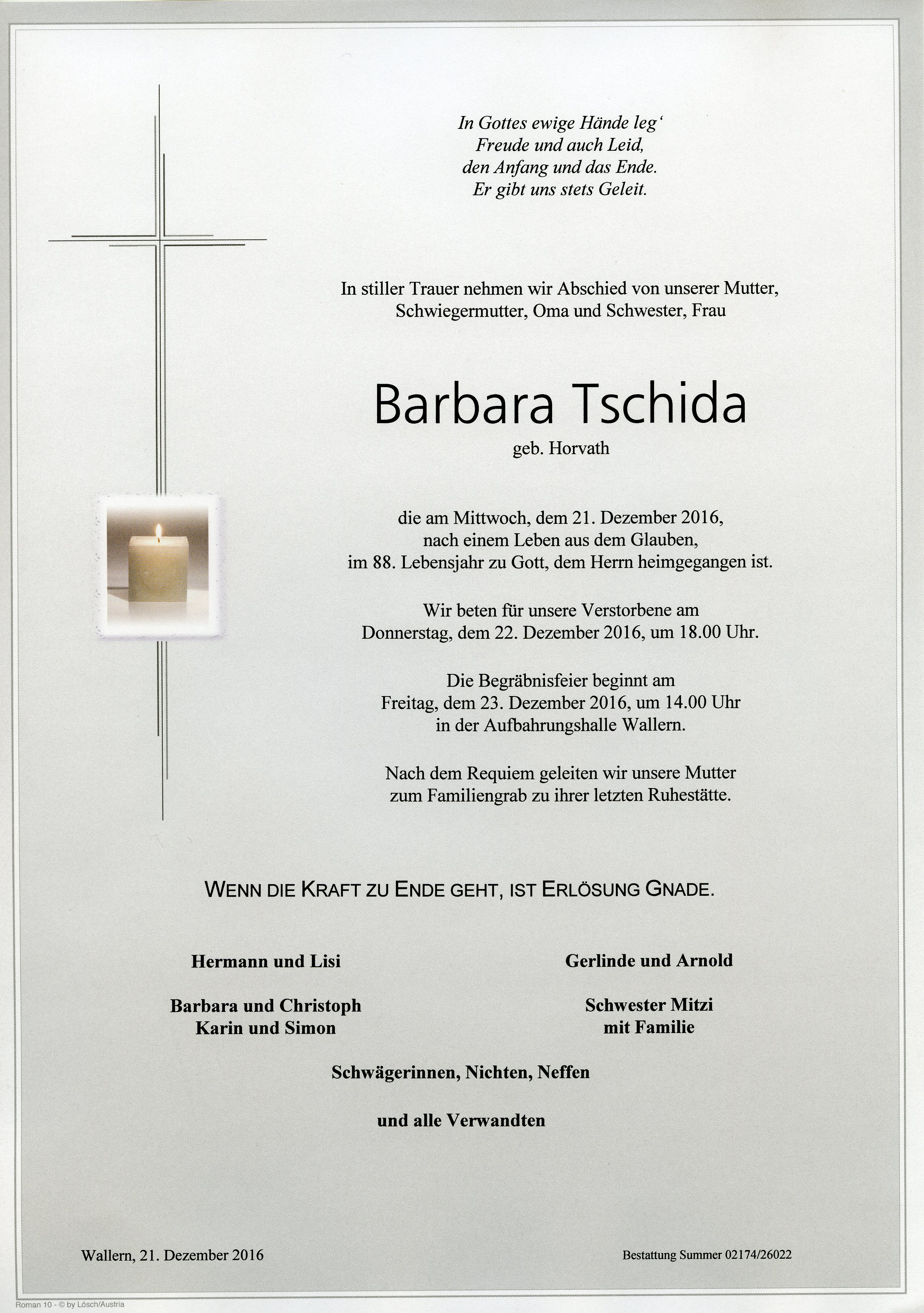 Tschida Barbara aus 7151 Wallern, gestorben am 21. Dezember 2016