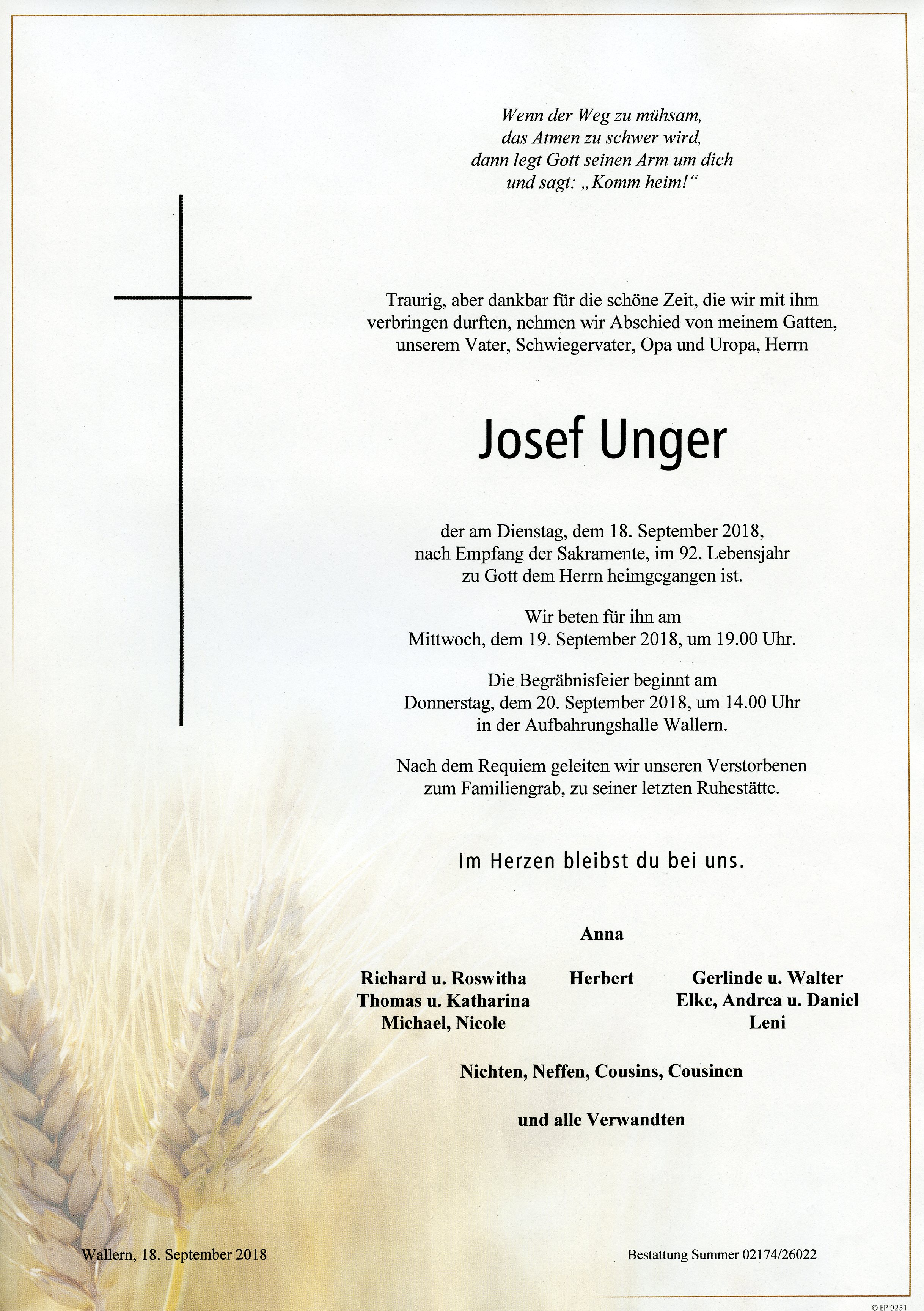 Unger Josef aus 7151 Wallern, gestorben am 11. Jänner 2017