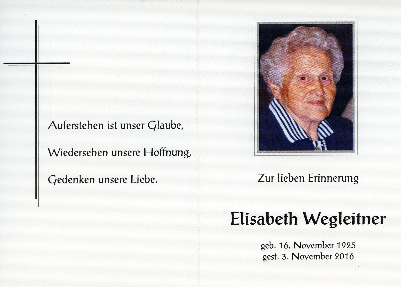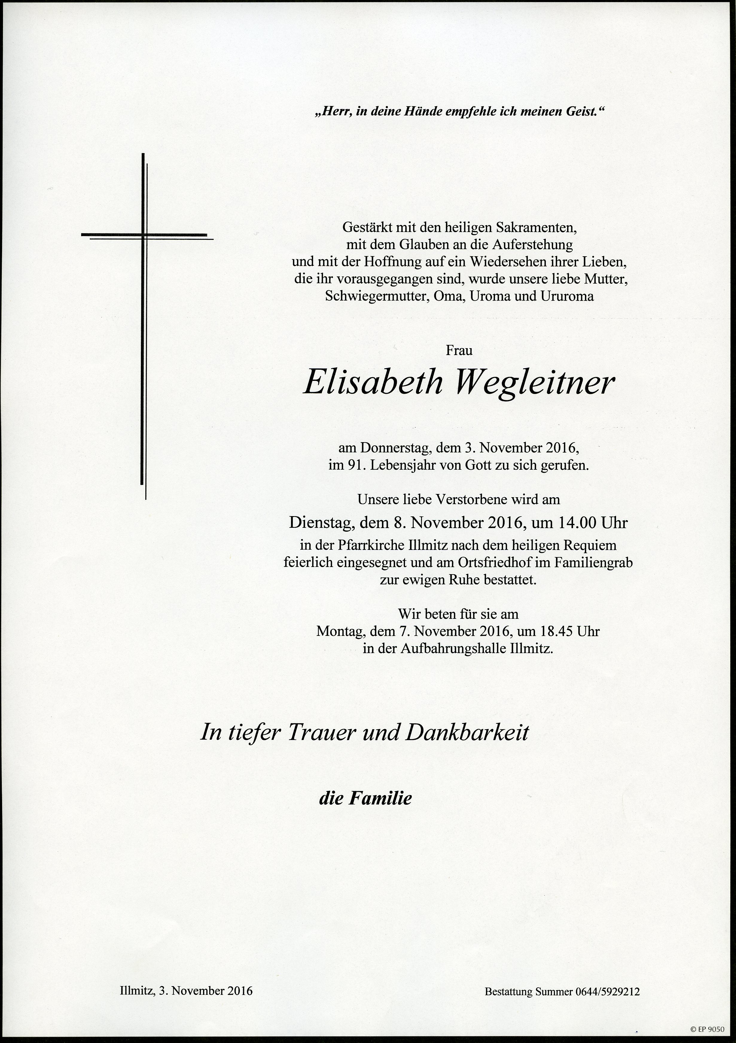 Wegleitner Elisabeth aus 7142 Illnitz, gestorben am 3. November 2016