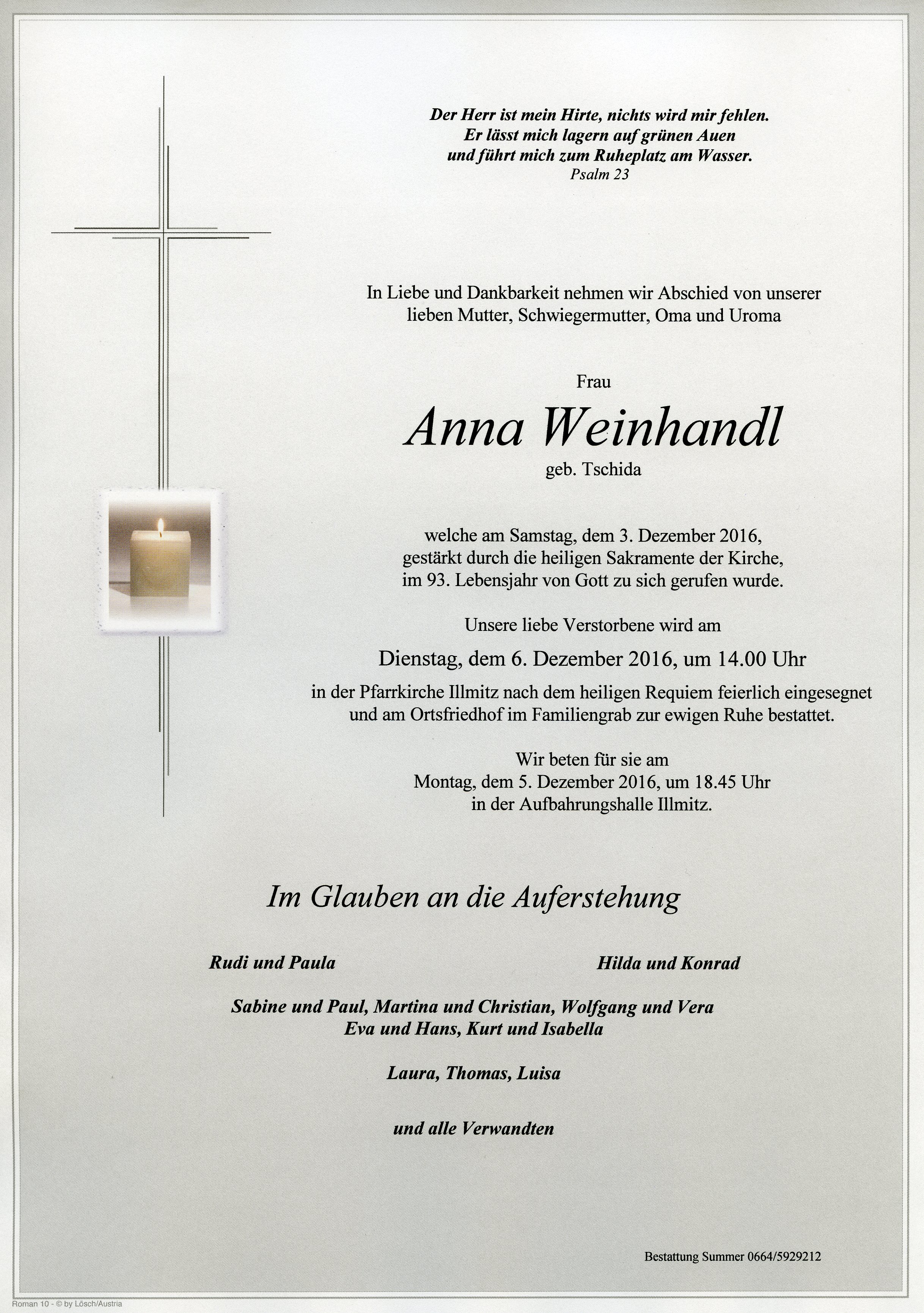 Weinhandl Anna aus 7142 Illmitz, gestorben am 3. Dezember 2016